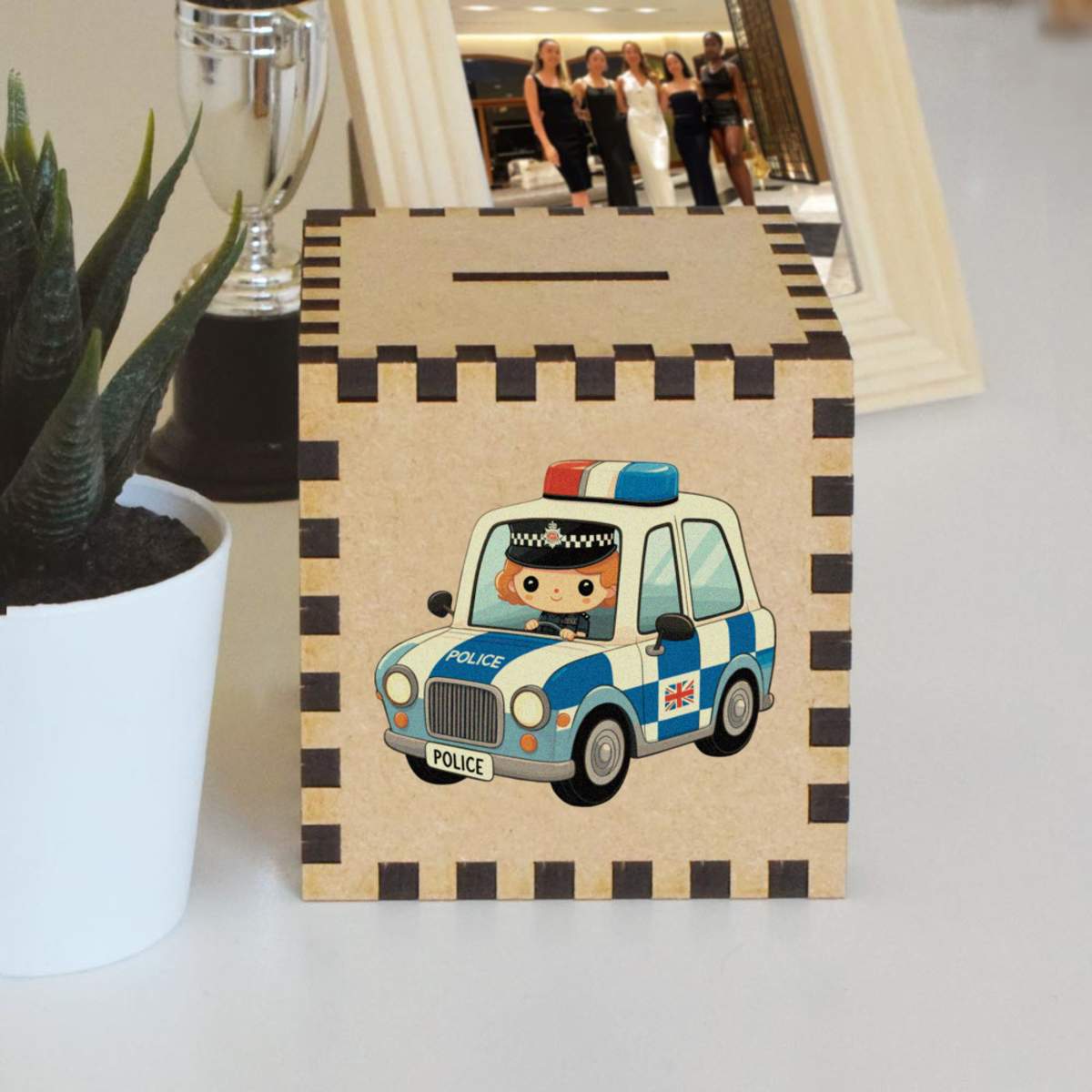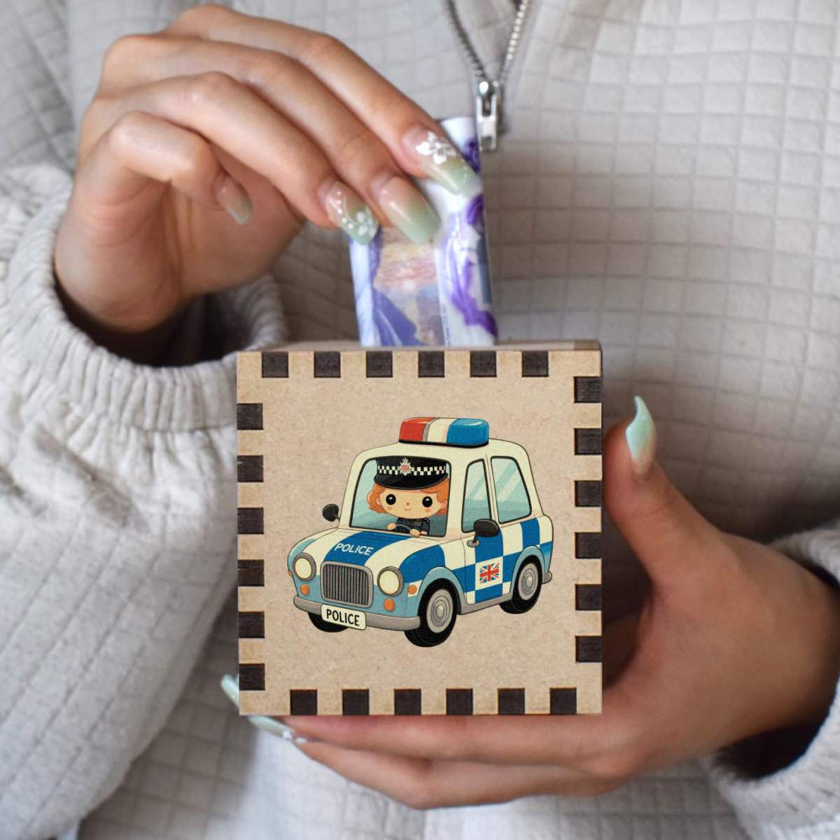 An 8.5cm wooden money box made out of the finest quality MDF and printed on all four sides with a unique design. The bottom is flat and the top has a slot for coins, the box itself is 85mm on each side, with a 35mm x 5mm coin slot, so please be sure it's suitable for you.