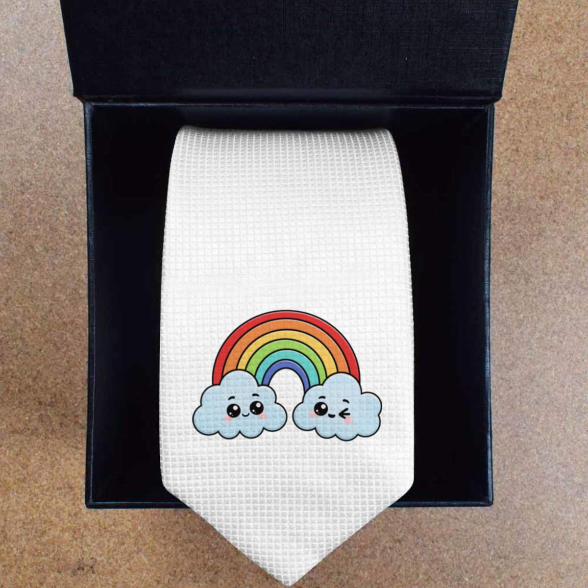 - Slim white tie with black presentation box