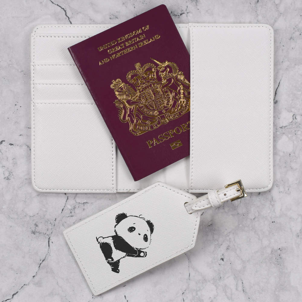 A luxury travel set for holiday makers and jet setters! This premium duo consists of a passport cover and matching luggage tag; both made from white, leather-look PU and printed with a unique design.