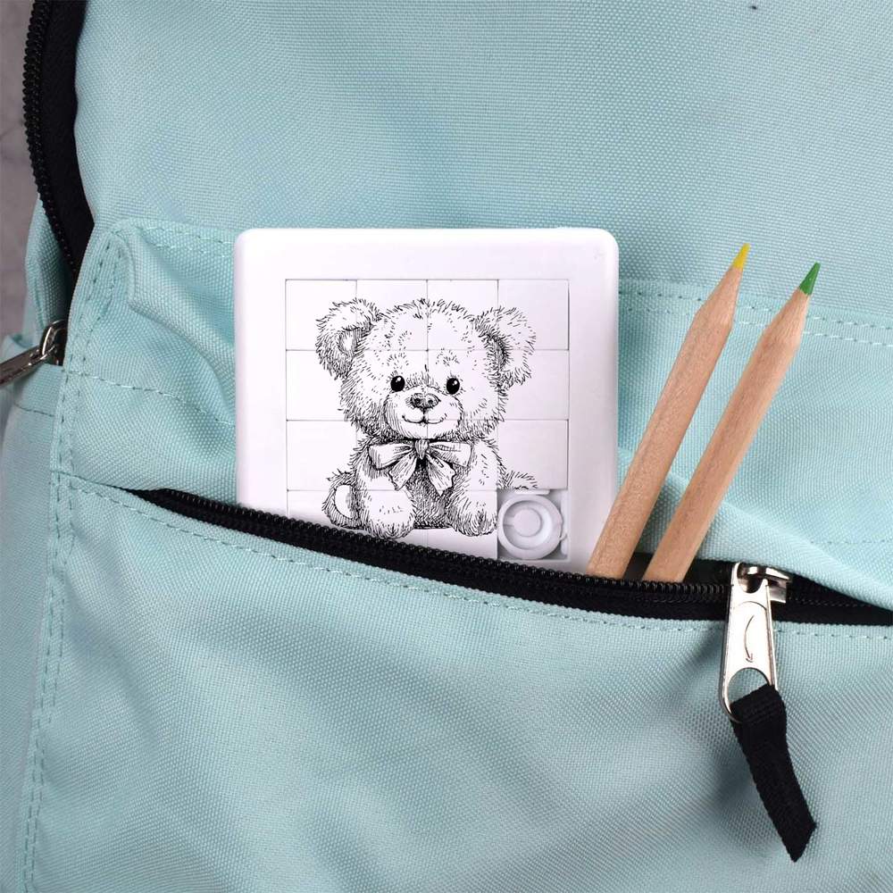 - Pocket sized puzzle with sliding square pieces