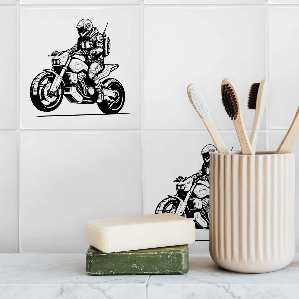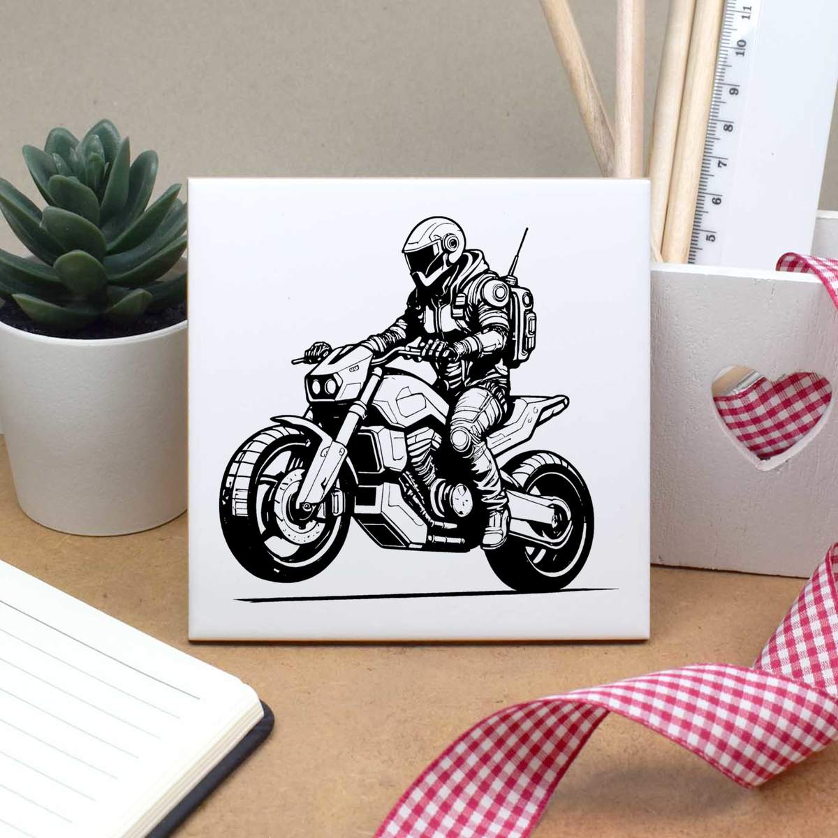 'Cyberpunk Nomad Riding Motorcycle' 108mm Square Ceramic Tile (TD00025446)
