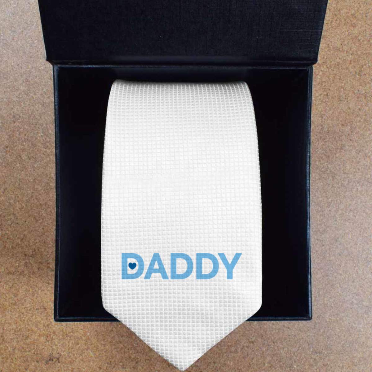 - Slim white tie with black presentation box