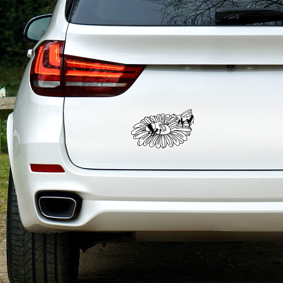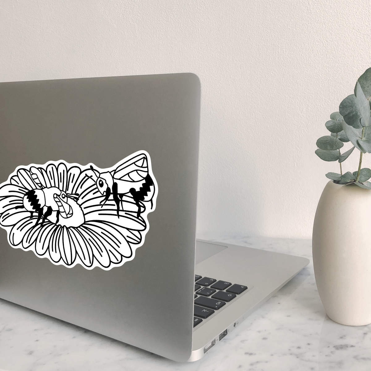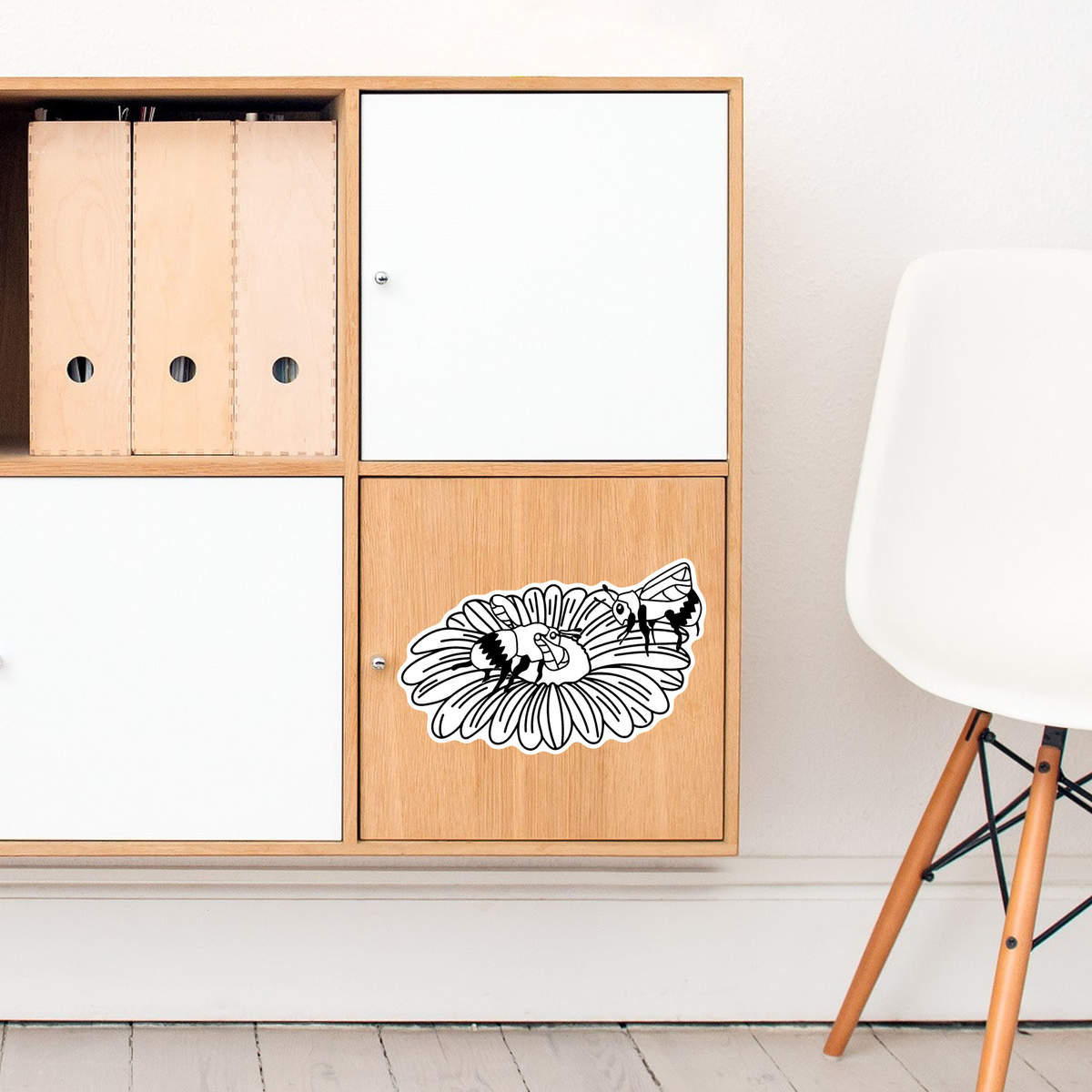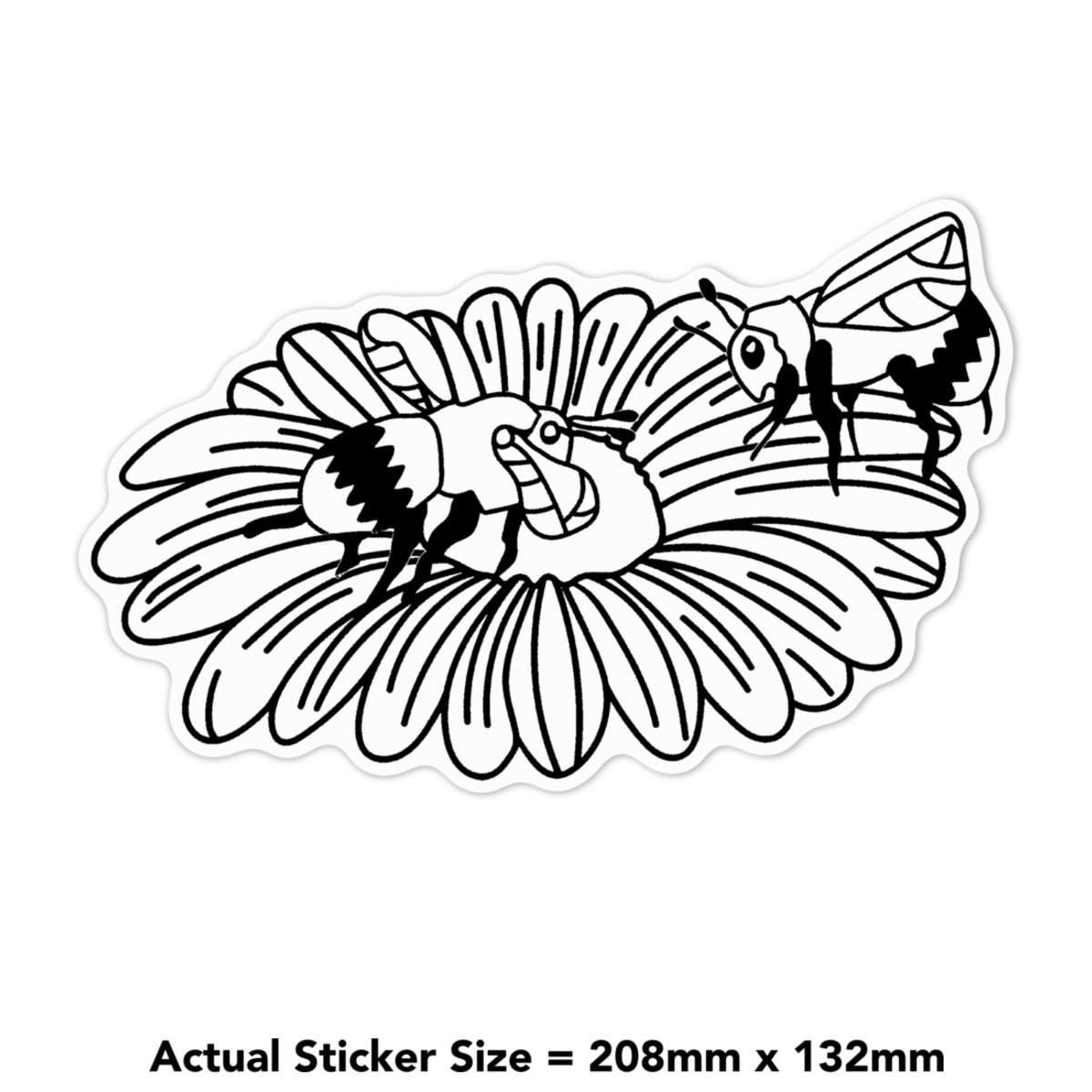 'A daisy blooms under the watch of two busy bees, capturing the harmony of nature in simple lines.'