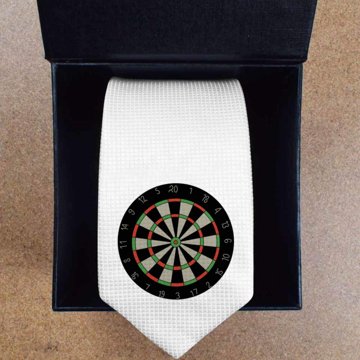 - Slim white tie with black presentation box