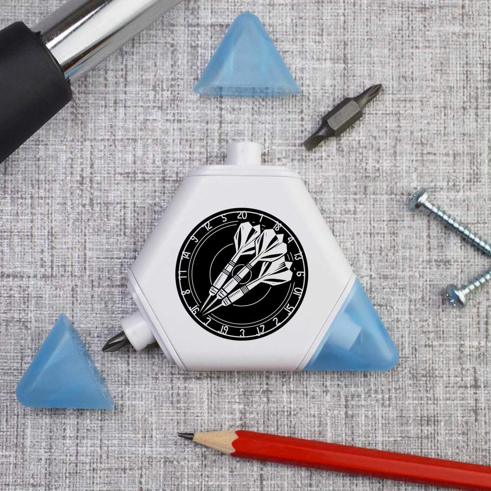 Our triangular compact multi tool is printed on one side with a unique design, making it a great gift for DIY lovers. This 3-in-1 tool set contains a tape measure and 2 different screwdriver attachments and each corner has a snap shut lid. One corner reveals a 1 meter tape measure, while the others hide two reversible screwdriver attachments, one larger and one smaller, both of which have a cross head on one end and a flat head on the other.