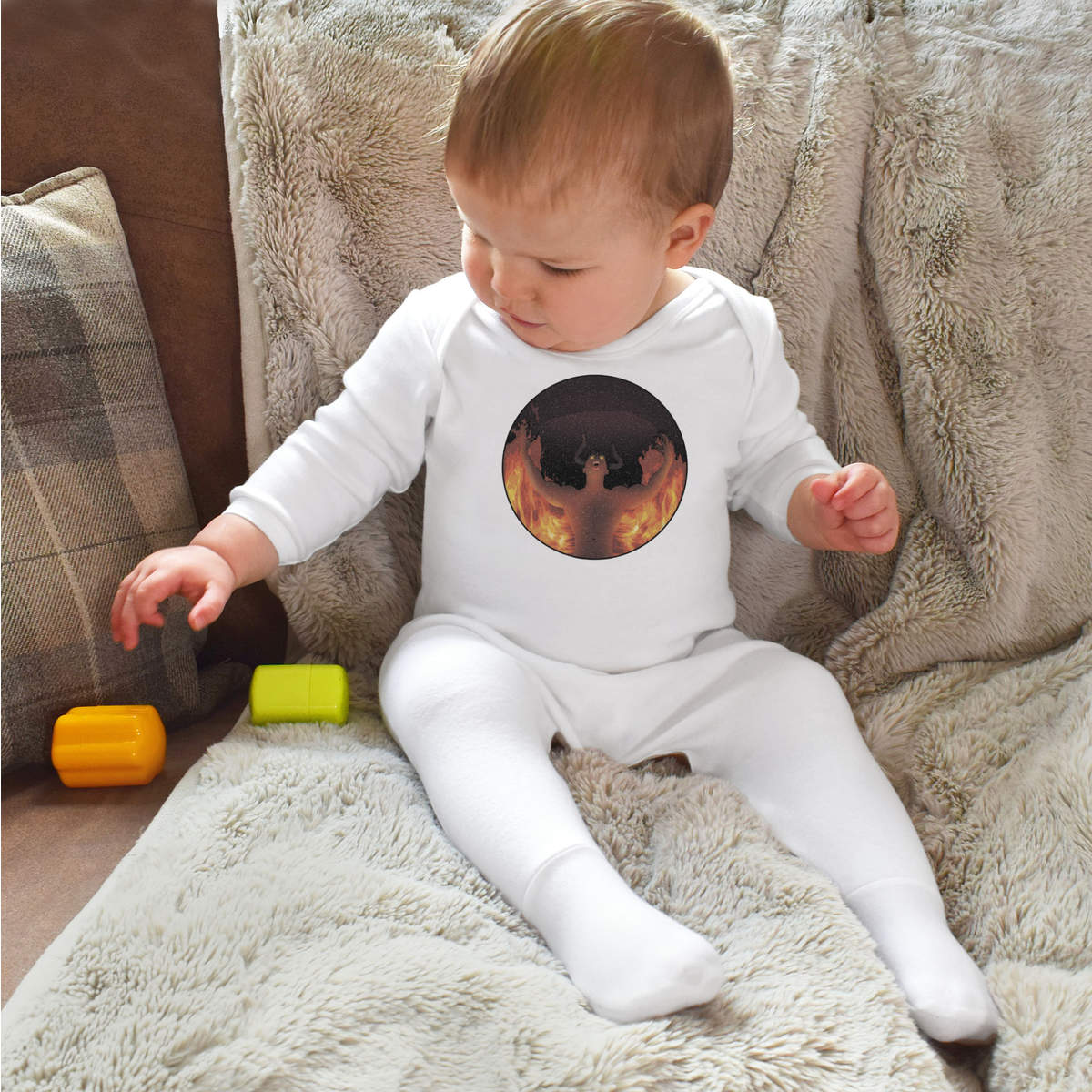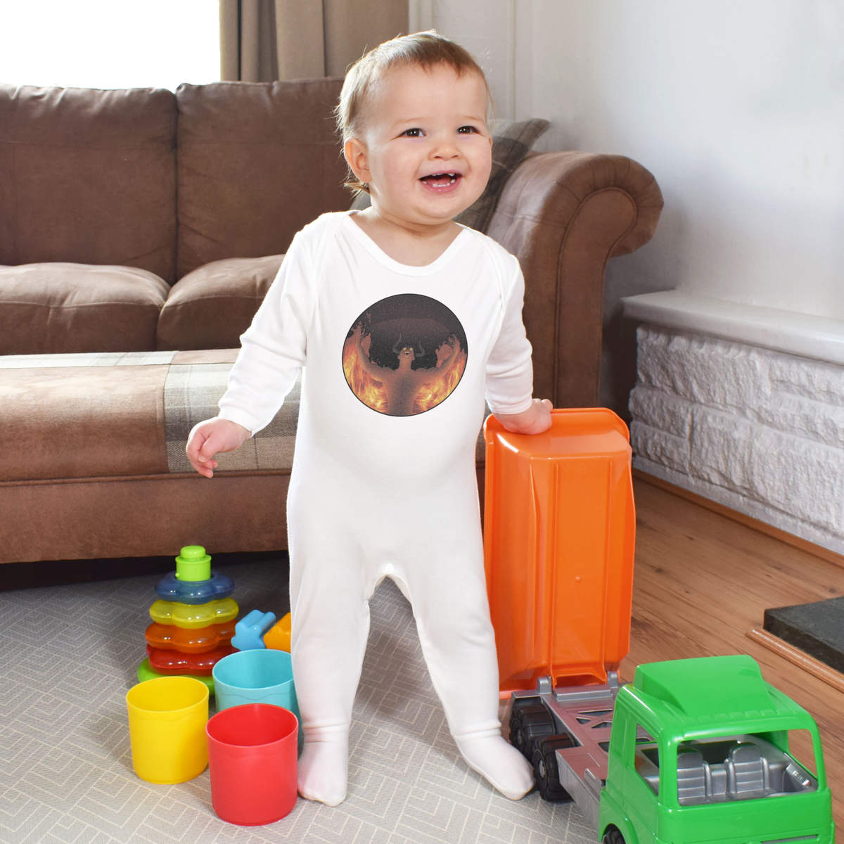 Little ones can sleep peacefully in this super soft romper sleepsuit. Our unisex jumpsuits are made from 100% cotton and are printed on the front with a unique design. Practical functions include popper fastenings for ease of changing and built-in feet.