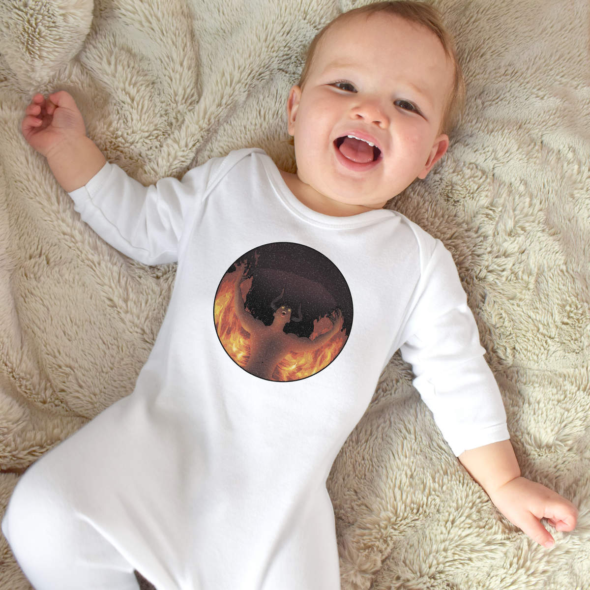 'A horned figure with glowing eyes screaming amidst intense flames.'