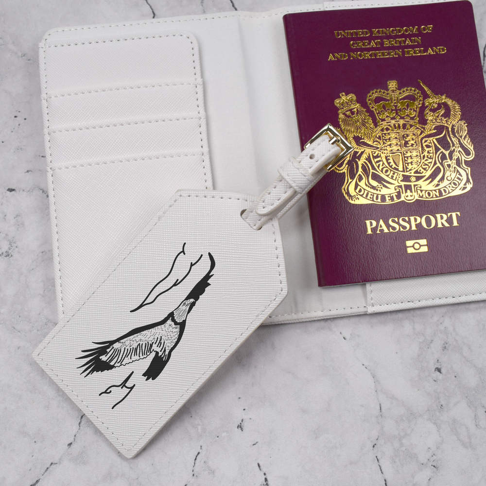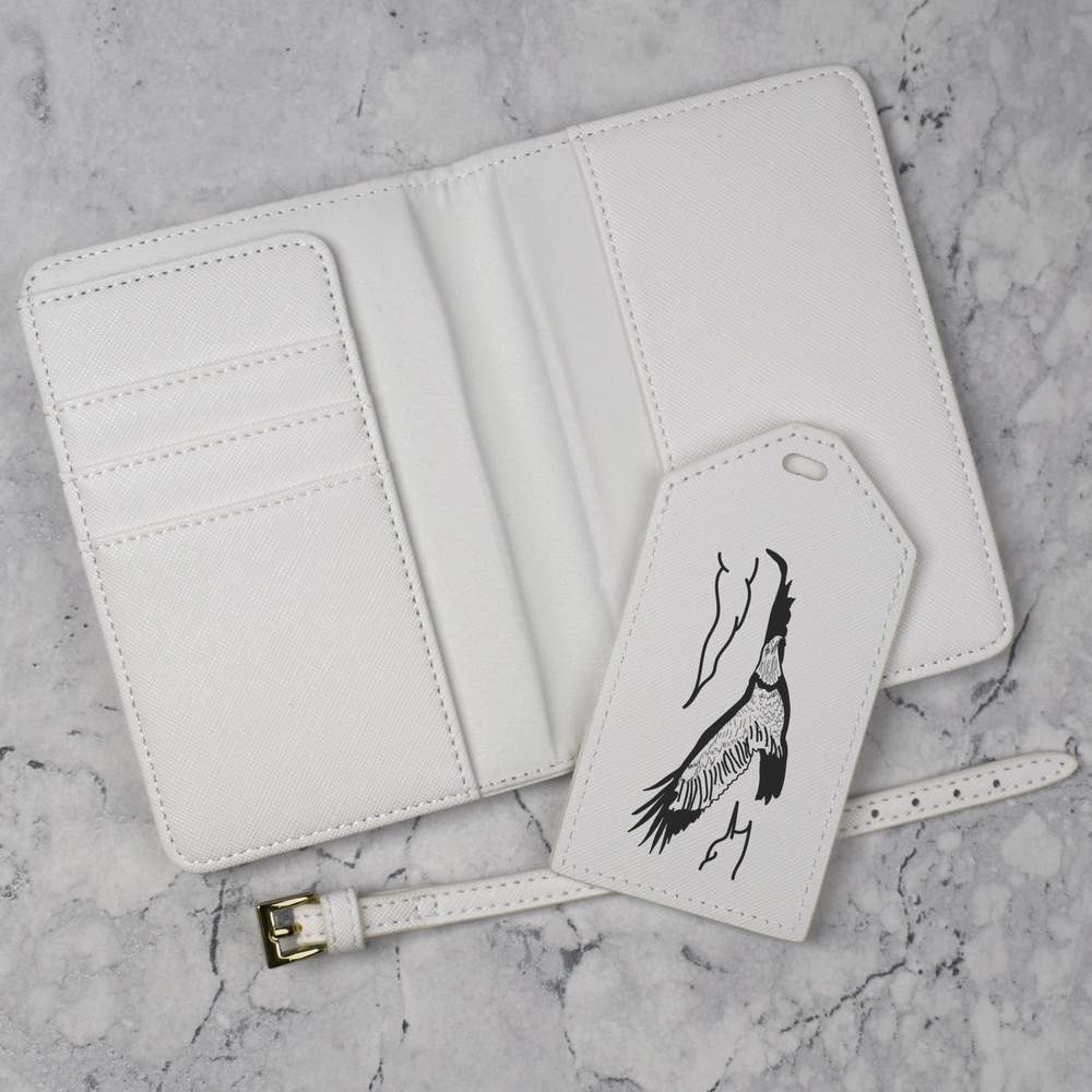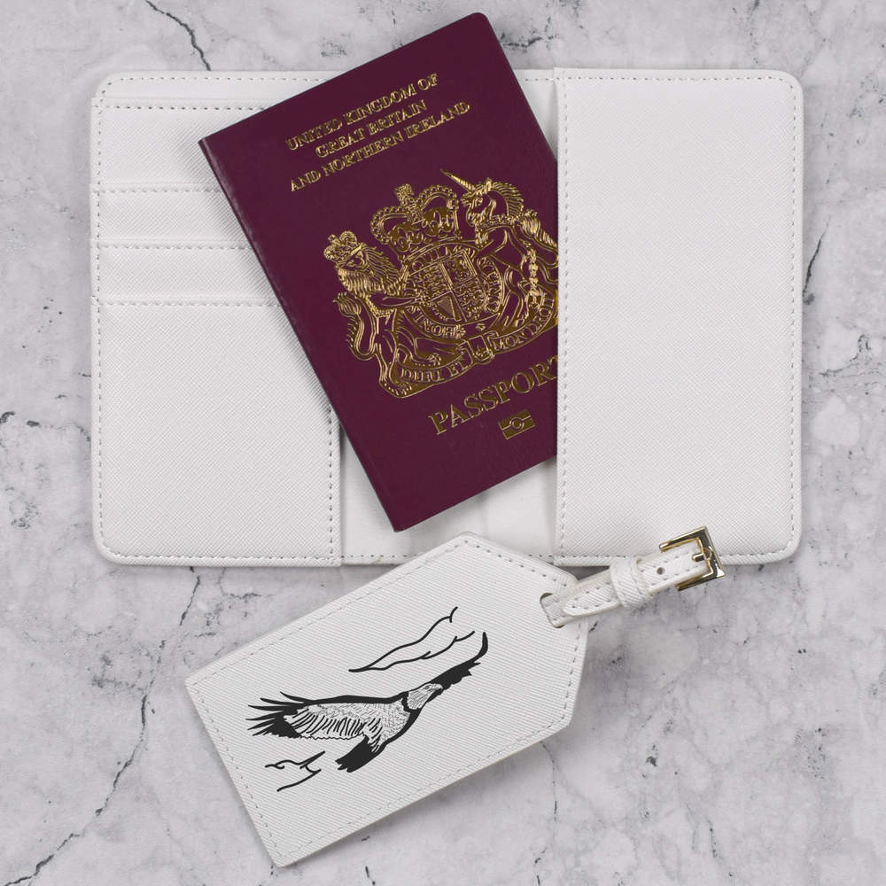 A luxury travel set for holiday makers and jet setters! This premium duo consists of a passport cover and matching luggage tag; both made from white, leather-look PU and printed with a unique design.