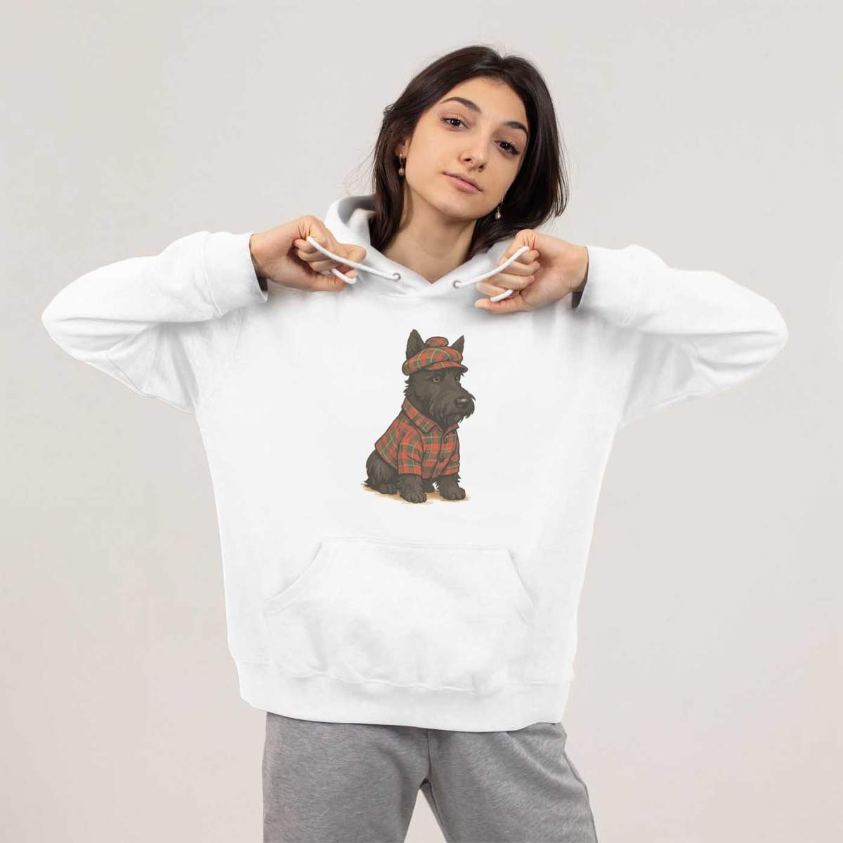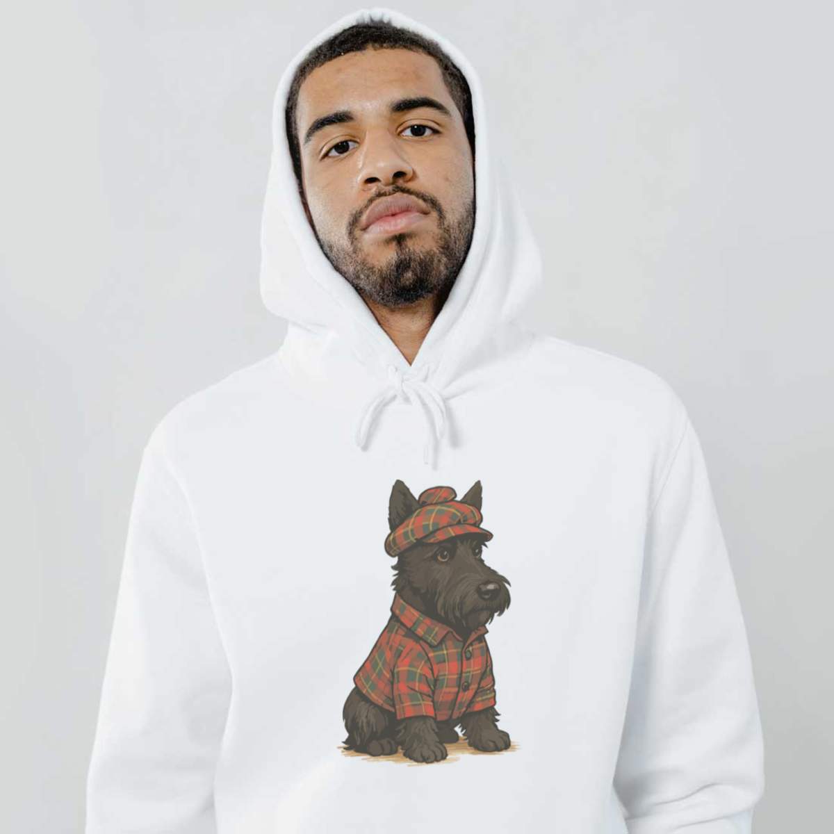 'A Scottish highland terrier wearing traditional tartan Scottish clothing.'