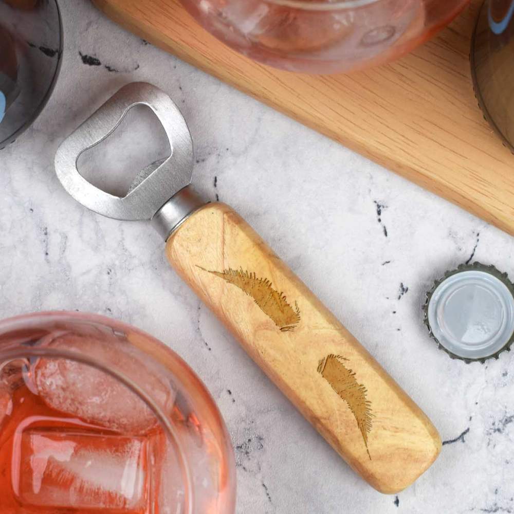 This beautiful wooden bottle opener is made from high quality beech wood and is engraved on one side with a unique design. It's practically sized for pockets and easily wiped clean, making it great for outdoor adventures and travelling.