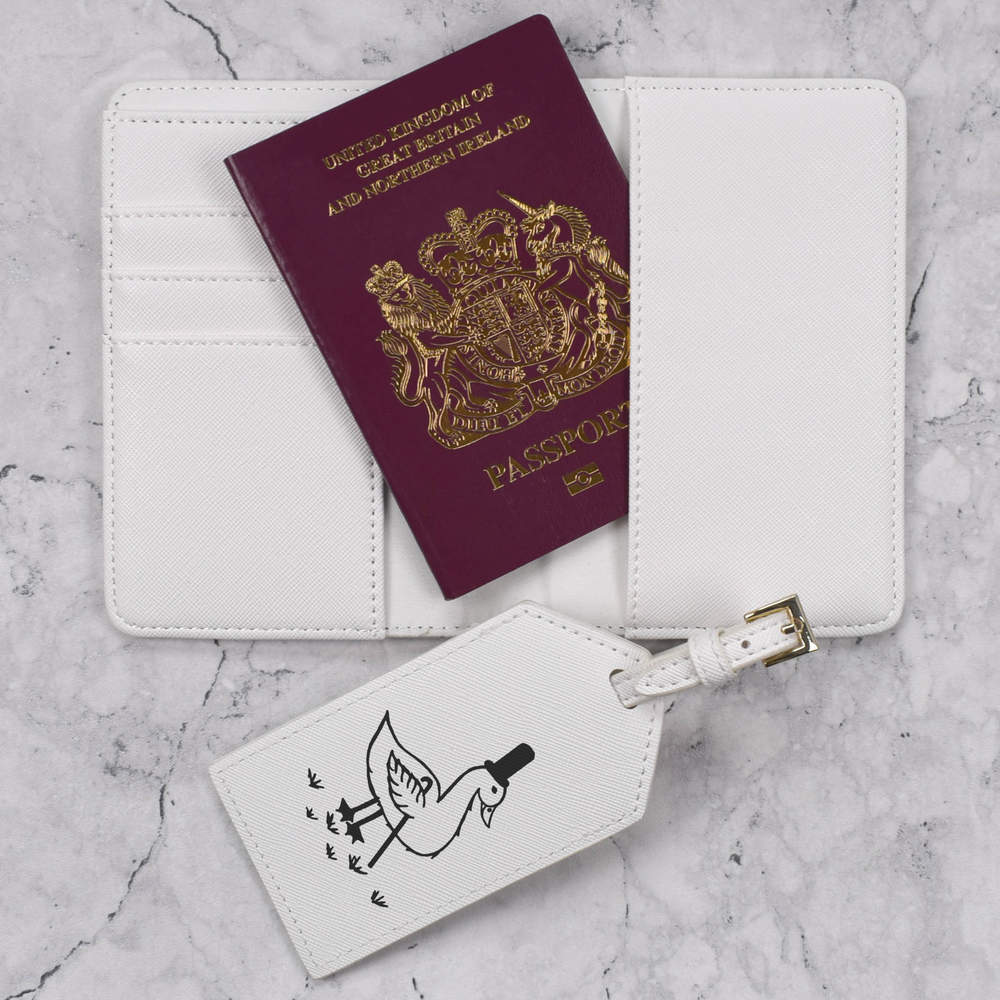 A luxury travel set for holiday makers and jet setters! This premium duo consists of a passport cover and matching luggage tag; both made from white, leather-look PU and printed with a unique design.