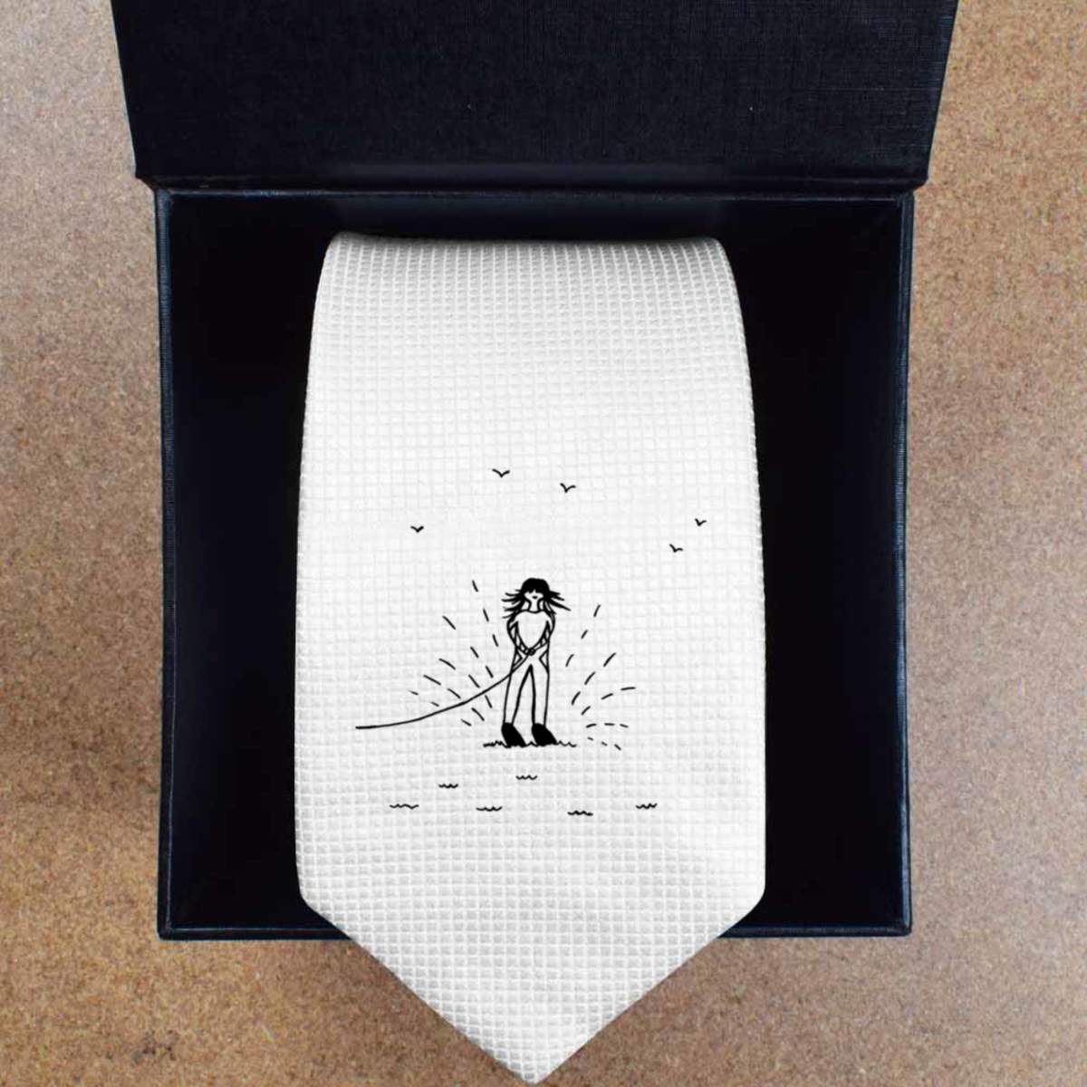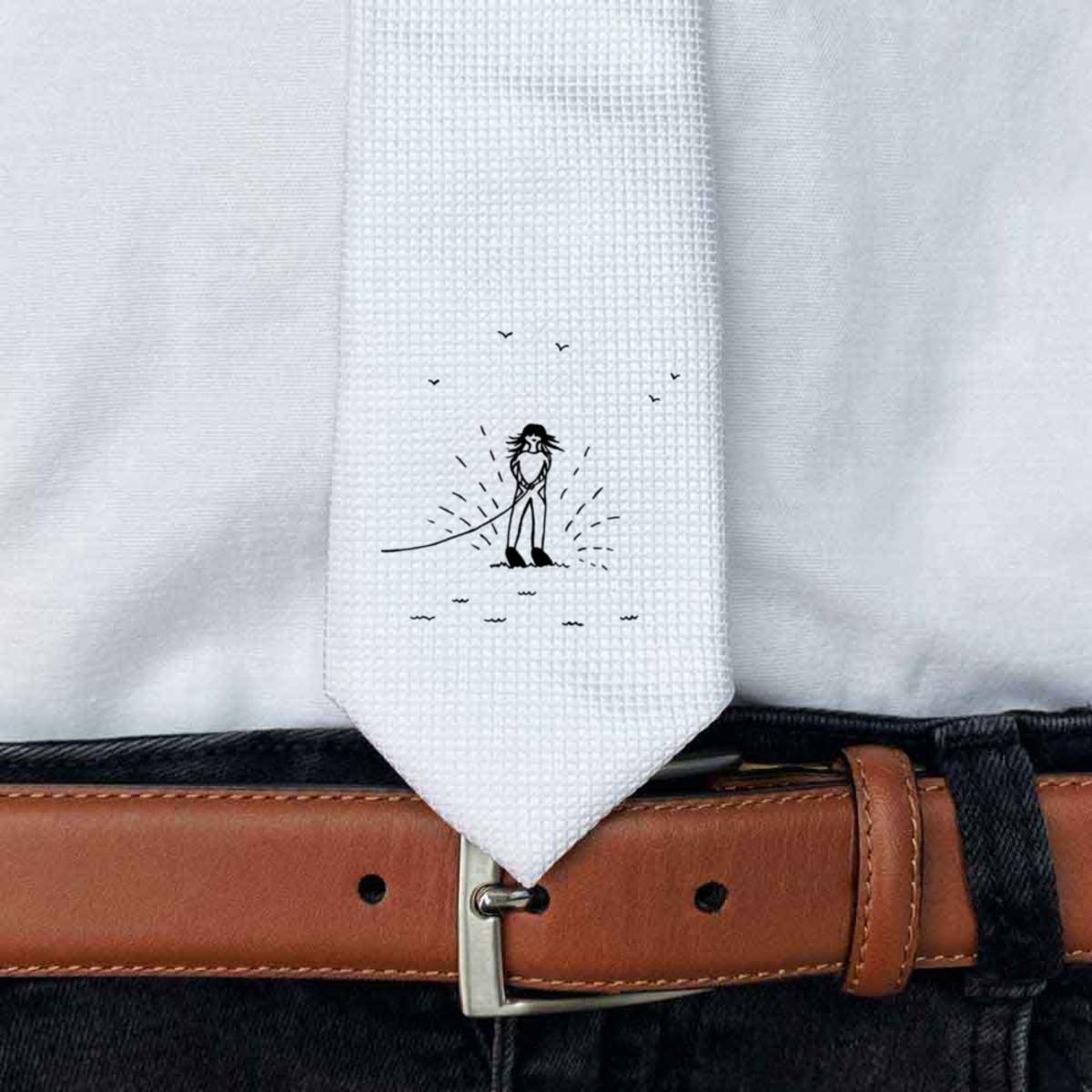 This stylish slim white tie is guaranteed to add class to any outfit. Printed on the front with a design from one of our talented designers, these ties are perfect for formal events, special occasions or making a statement at the office.