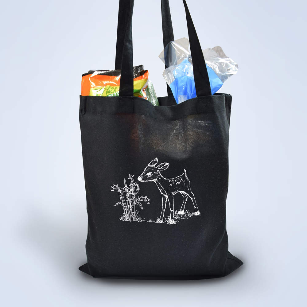 'Fawn With Bluebells' Classic Black Tote Shopper Bag (ZB00001872)