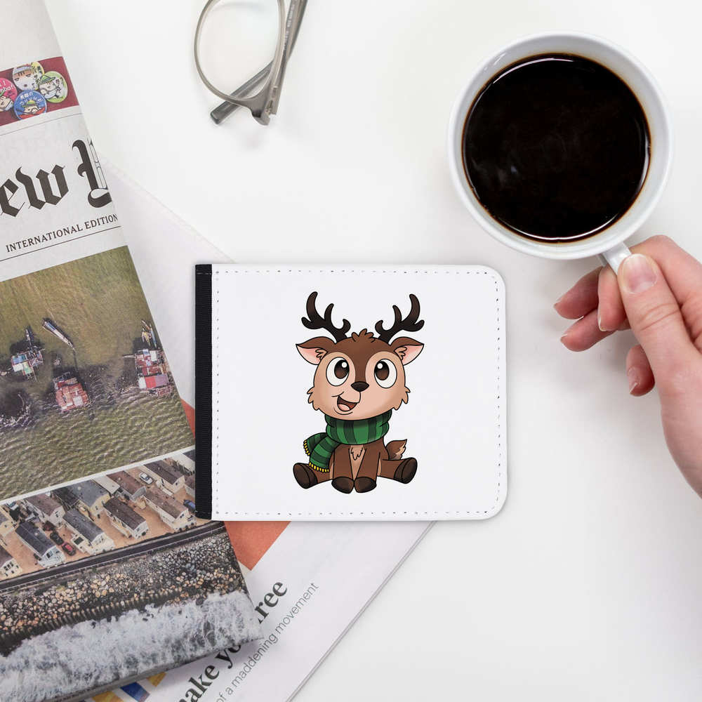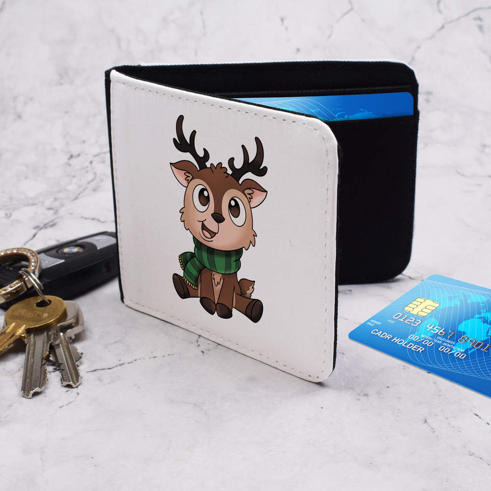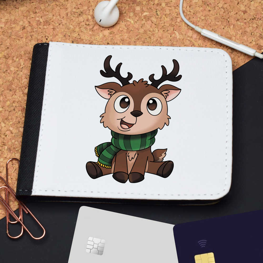 'A cute baby reindeer wearing a green striped scarf.'