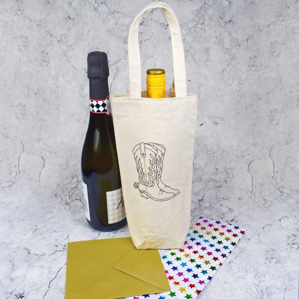 Give a gift in style with this wonderful wine bottle bag. Printed one side with a unique design, this bag oozes with class. Each one is made from thick natural canvas and its high quality finish means it can be used again and again; perfect for picnics and adventures where a bottle of the finest wine is required. This bottle bag can comfortably carry a single standard wine or champagne bottle, up to 1.5 litres, but please check the bag dimensions are suitable before purchasing.