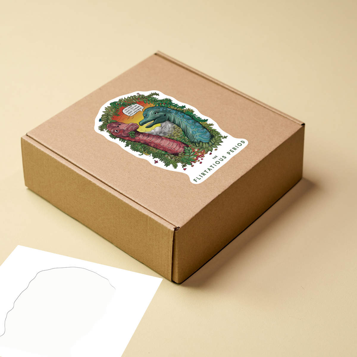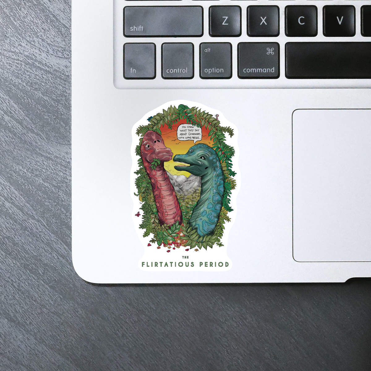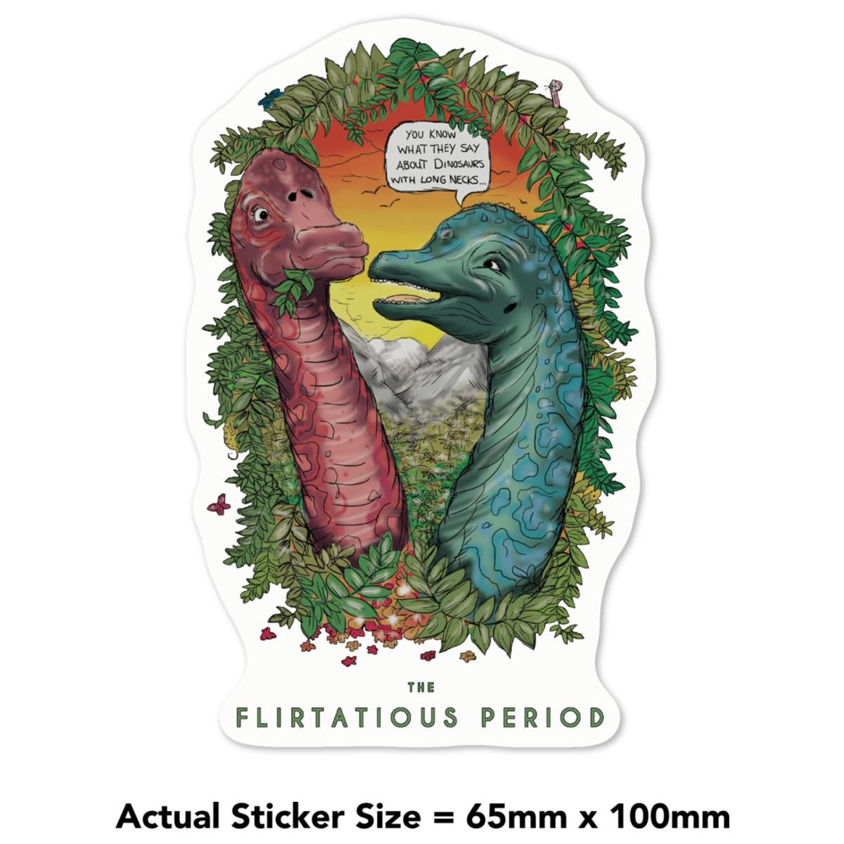 'This couple of Brachiosaurus love to flirt in the sunset, the cute characters sit within a jungle surrounded by a wreath of Jurassic plants and hiding creatures you won’t see at first. This wacky design is finished with a fun joke “You know what they say about dinosaurs with long necks…”.'