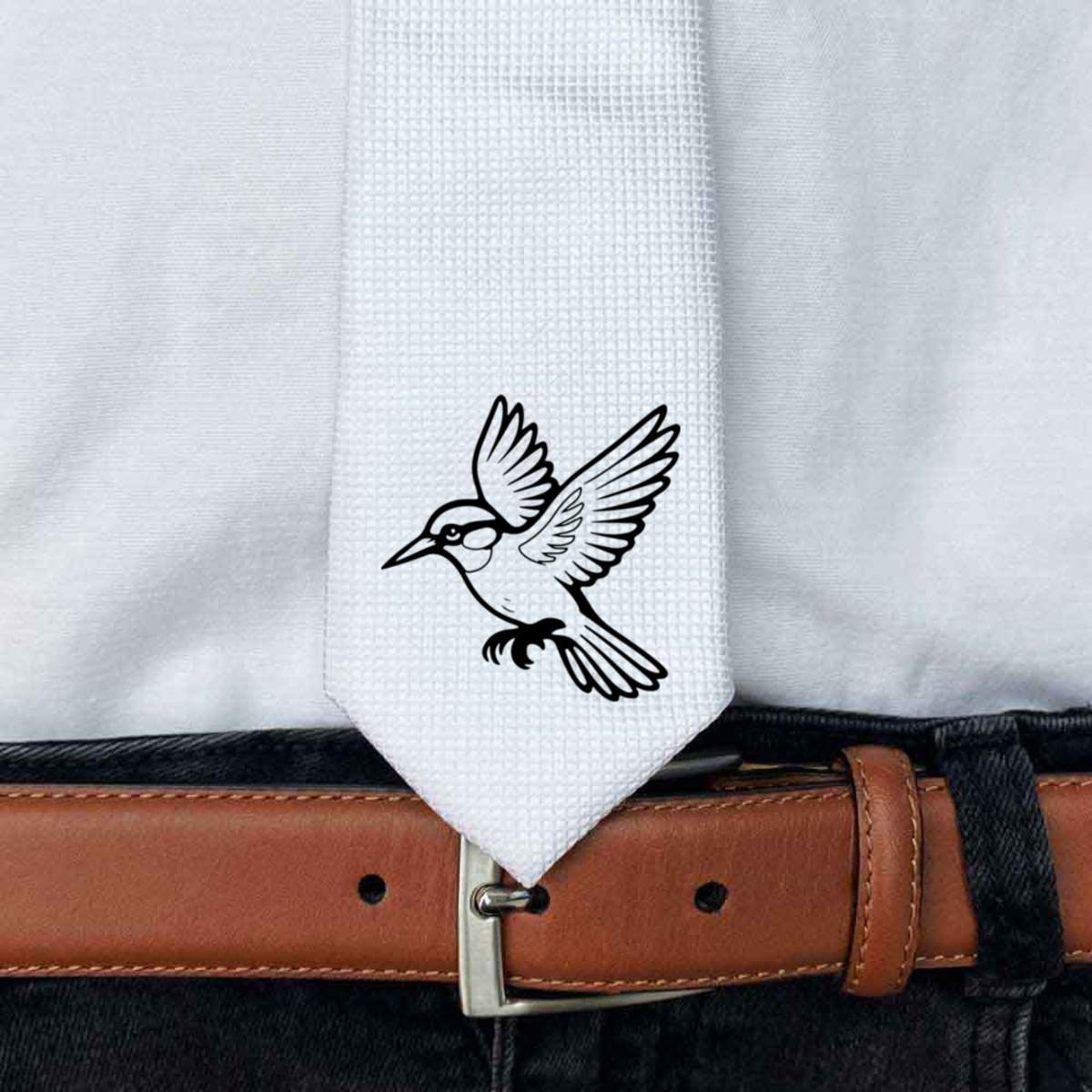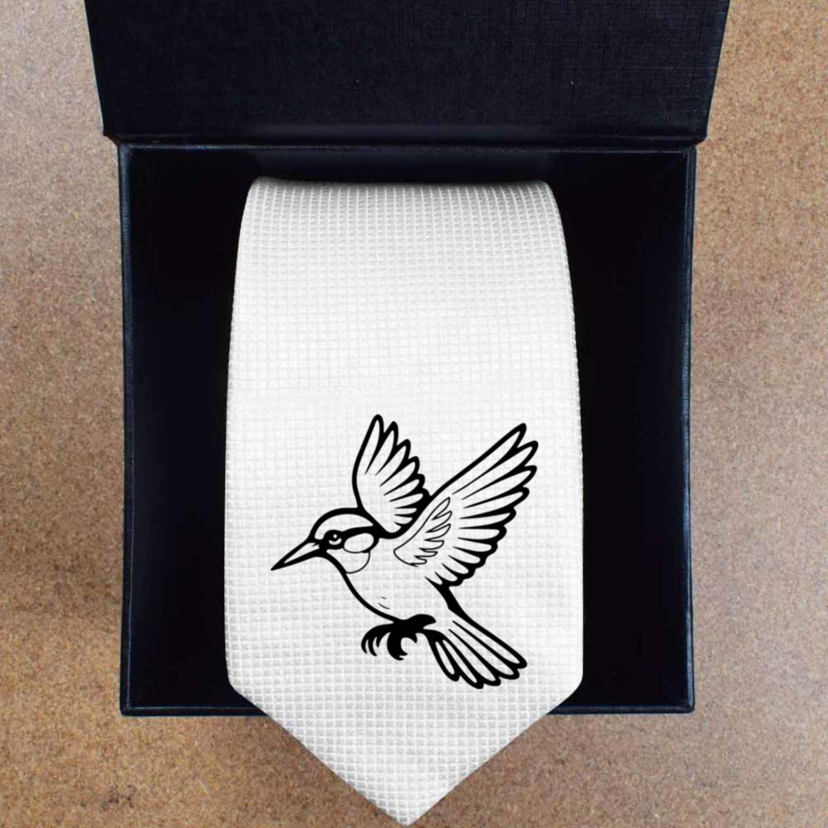 This stylish slim white tie is guaranteed to add class to any outfit. Printed on the front with a design from one of our talented designers, these ties are perfect for formal events, special occasions or making a statement at the office.