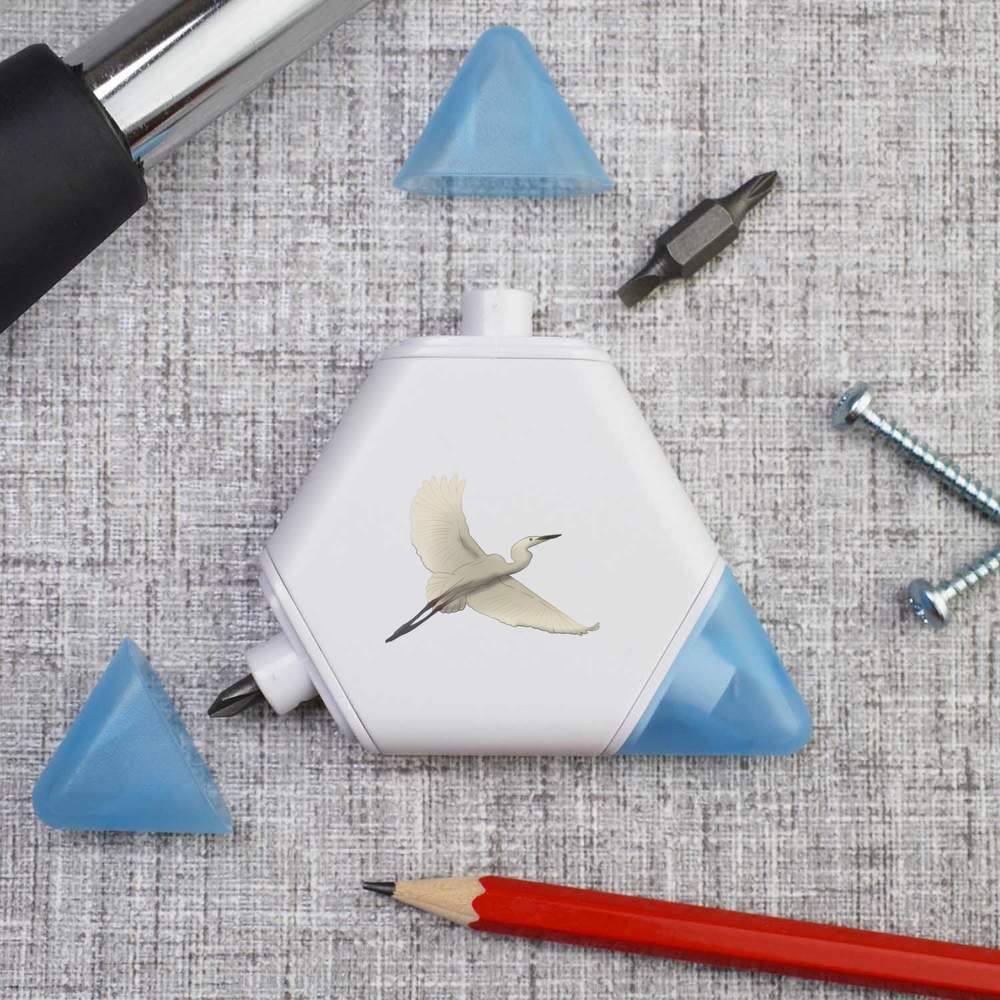 Our triangular compact multi tool is printed on one side with a unique design, making it a great gift for DIY lovers. This 3-in-1 tool set contains a tape measure and 2 different screwdriver attachments and each corner has a snap shut lid. One corner reveals a 1 meter tape measure, while the others hide two reversible screwdriver attachments, one larger and one smaller, both of which have a cross head on one end and a flat head on the other.