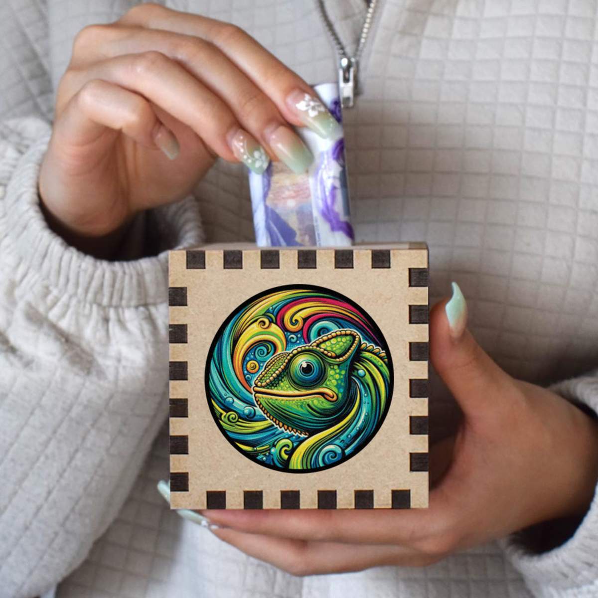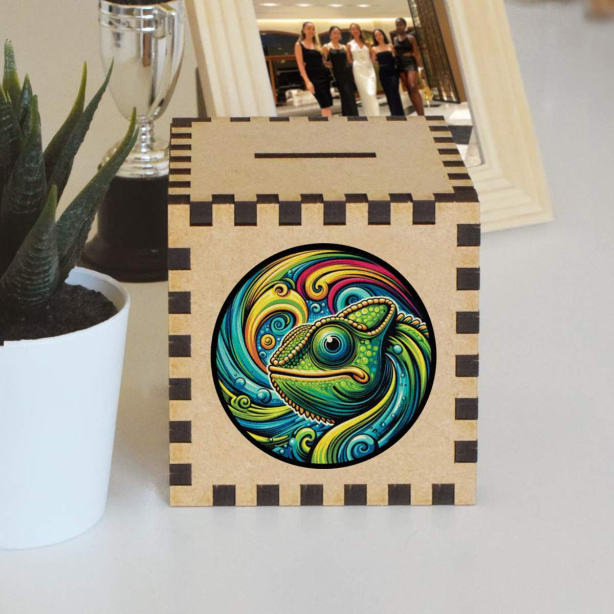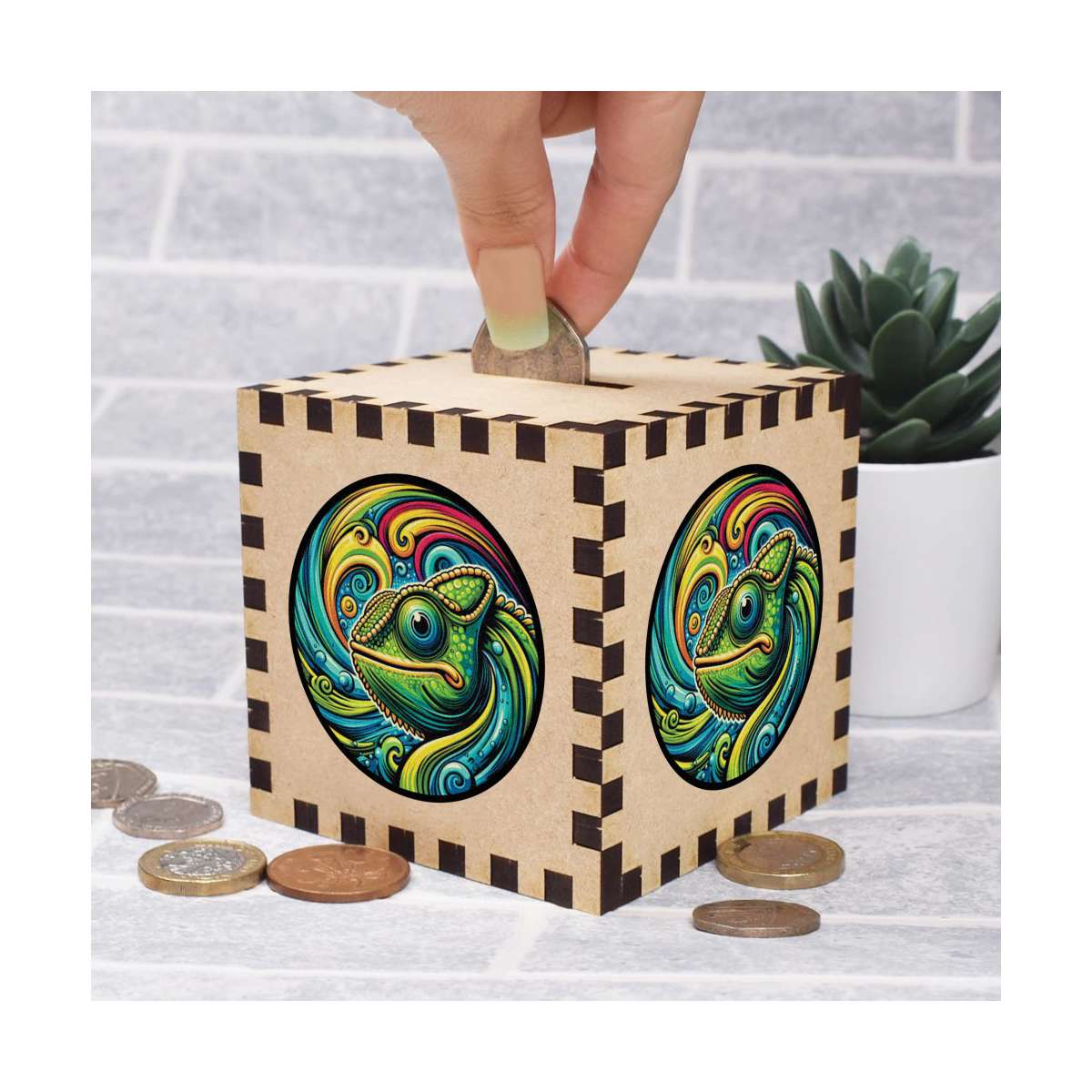 An 8.5cm wooden money box made out of the finest quality MDF and printed on all four sides with a unique design. The bottom is flat and the top has a slot for coins, the box itself is 85mm on each side, with a 35mm x 5mm coin slot, so please be sure it's suitable for you.