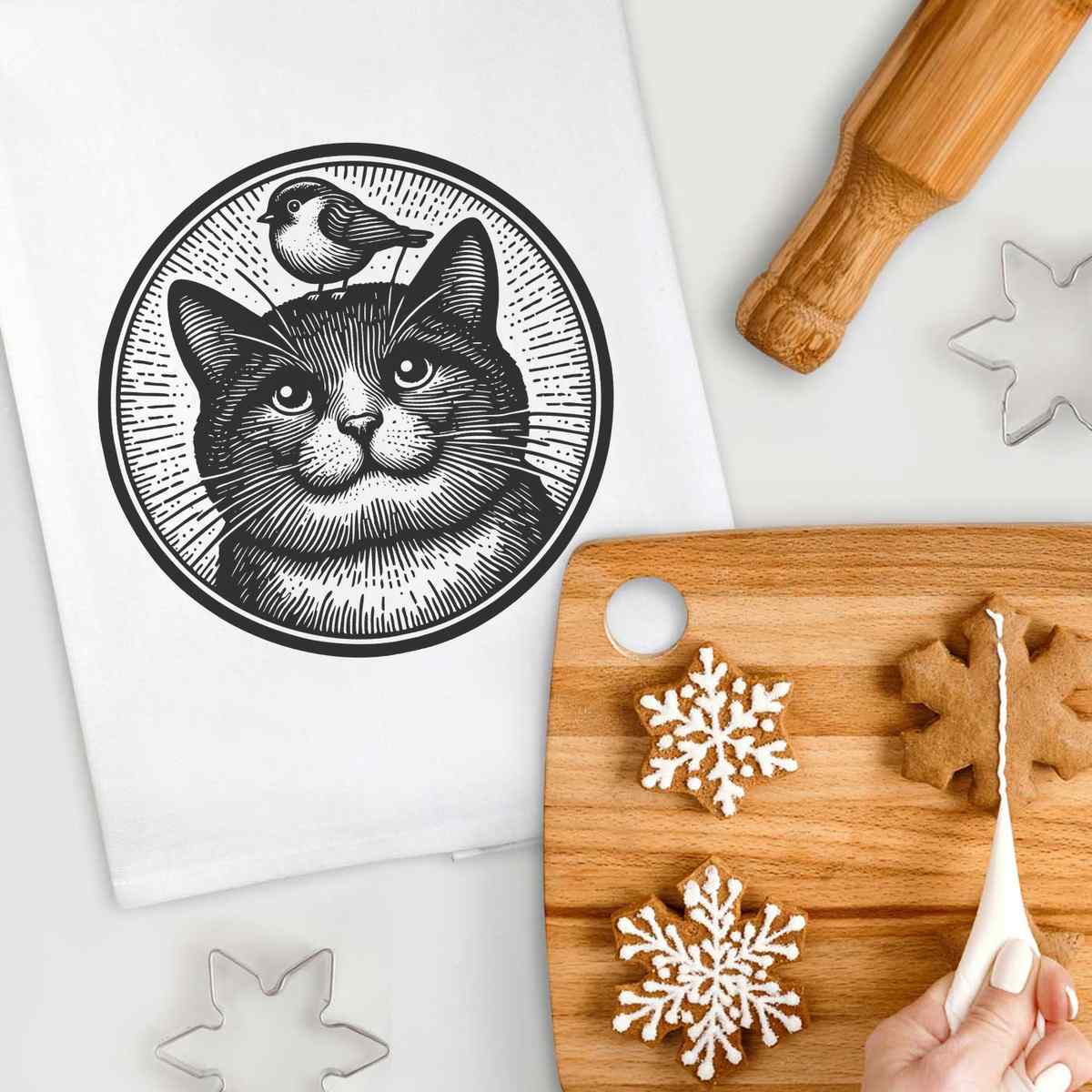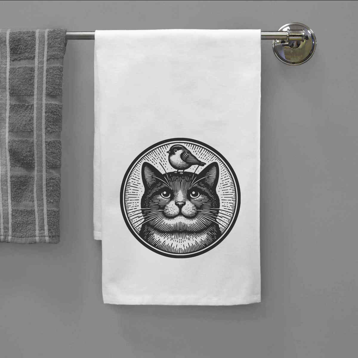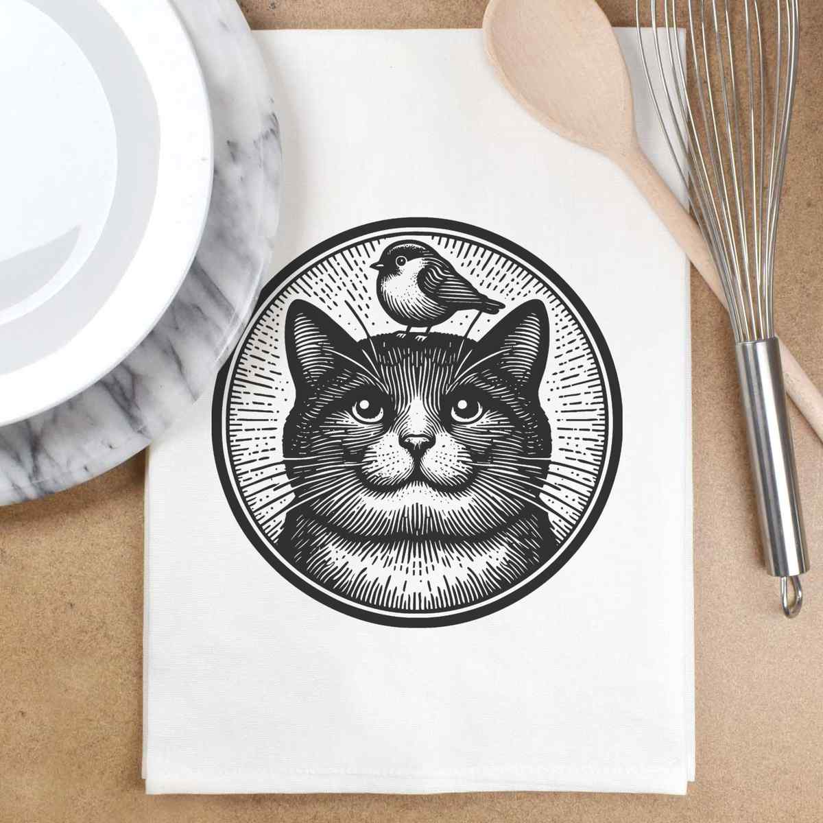 'Funny Illustration of a Cat with a Bird on it's Head'