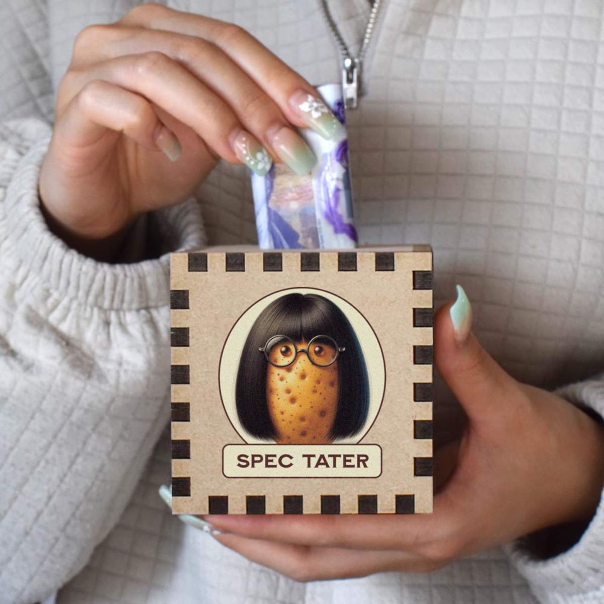 An 8.5cm wooden money box made out of the finest quality MDF and printed on all four sides with a unique design. The bottom is flat and the top has a slot for coins, the box itself is 85mm on each side, with a 35mm x 5mm coin slot, so please be sure it's suitable for you.
