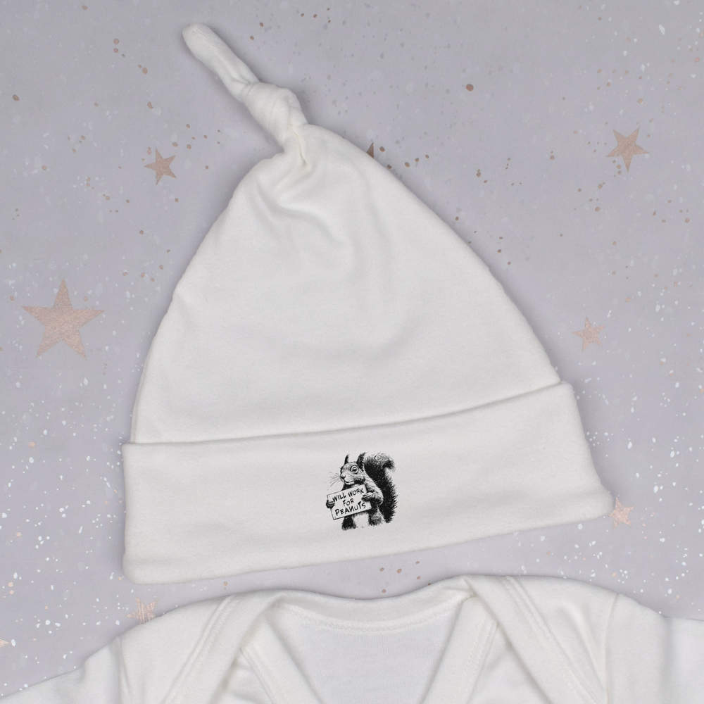 Keep little ones cosy and stylish with this super soft beanie hat. Our baby beanie hats have a knotted top and are printed on the turnover with a unique design. Made from 100% cotton, it can be machine washed and still retain its shape. This beanie hat has a stretch fit so one size fits all, with an approximate circumference of 32cm, it's ideal for babies up to 12 months old.