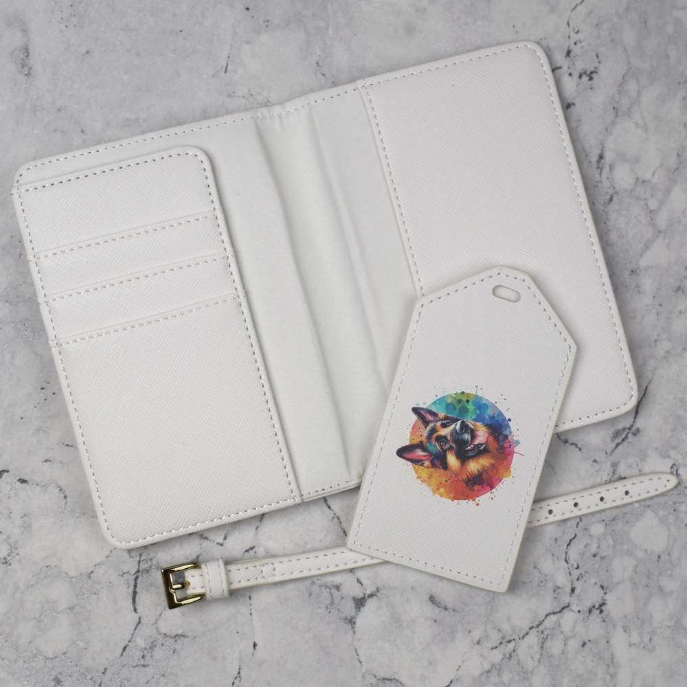 A luxury travel set for holiday makers and jet setters! This premium duo consists of a passport cover and matching luggage tag; both made from white, leather-look PU and printed with a unique design.