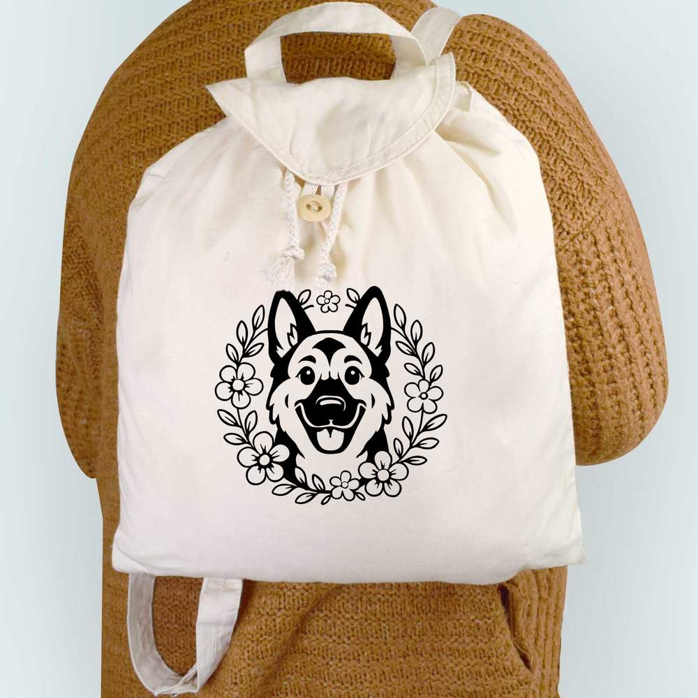 'A happy German Shepherd dog inside a floral wreath.'