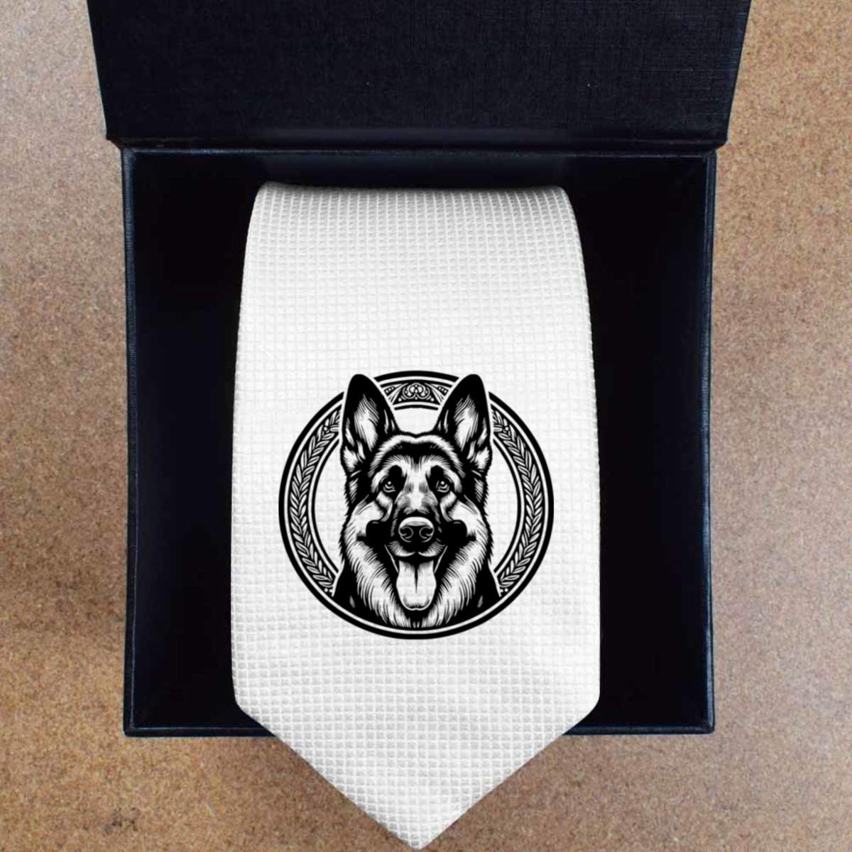 This stylish slim white tie is guaranteed to add class to any outfit. Printed on the front with a design from one of our talented designers, these ties are perfect for formal events, special occasions or making a statement at the office.