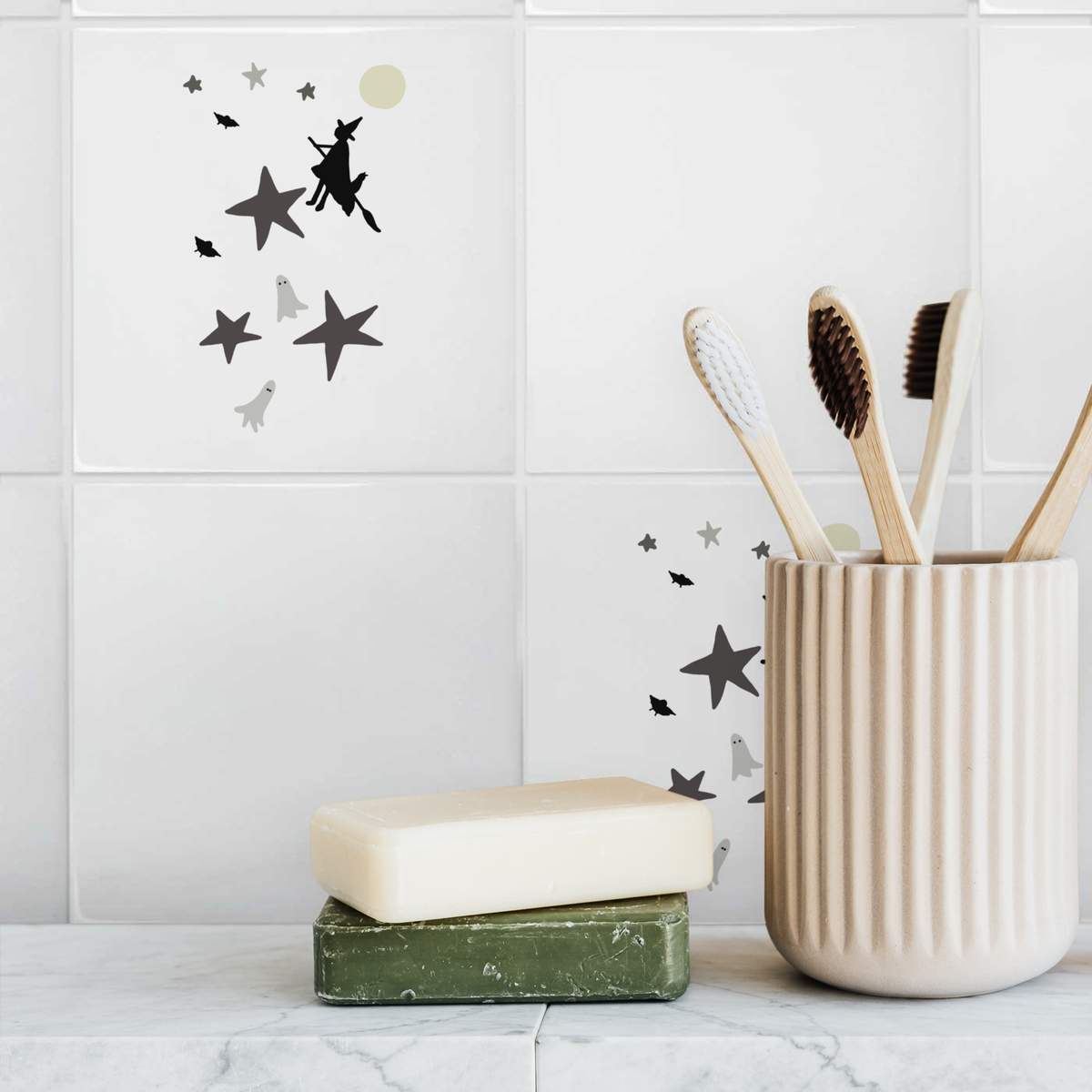 'Ghosts, witch, cat, stars, bats. '