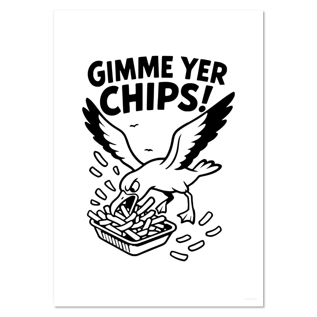 'A cheeky seagull swooping in to snatch some chips, a familiar sight by the British seaside'
