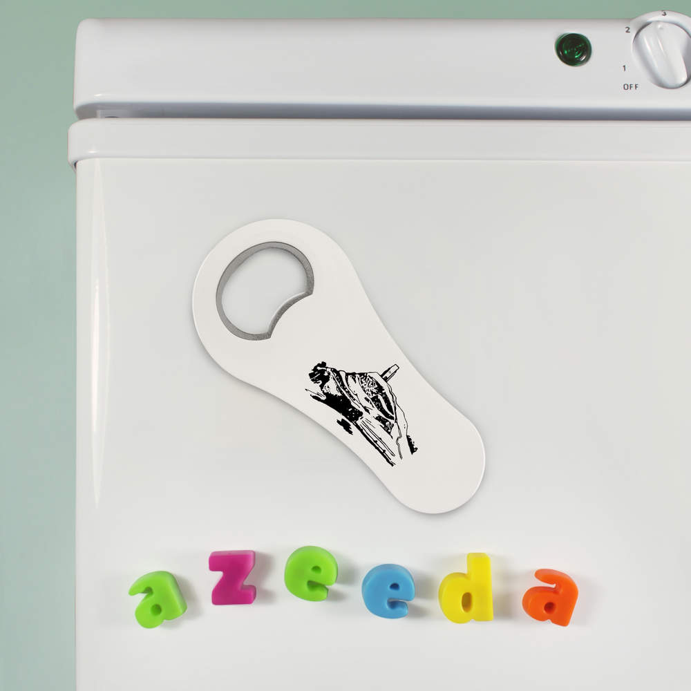 Pop the top where ever you are with this slim, lightweight bottle opener. Made from durable white plastic and printed on one side with a unique design. The back of the bottle opener has a small magnet, making it easy to stick to a fridge full of beer
