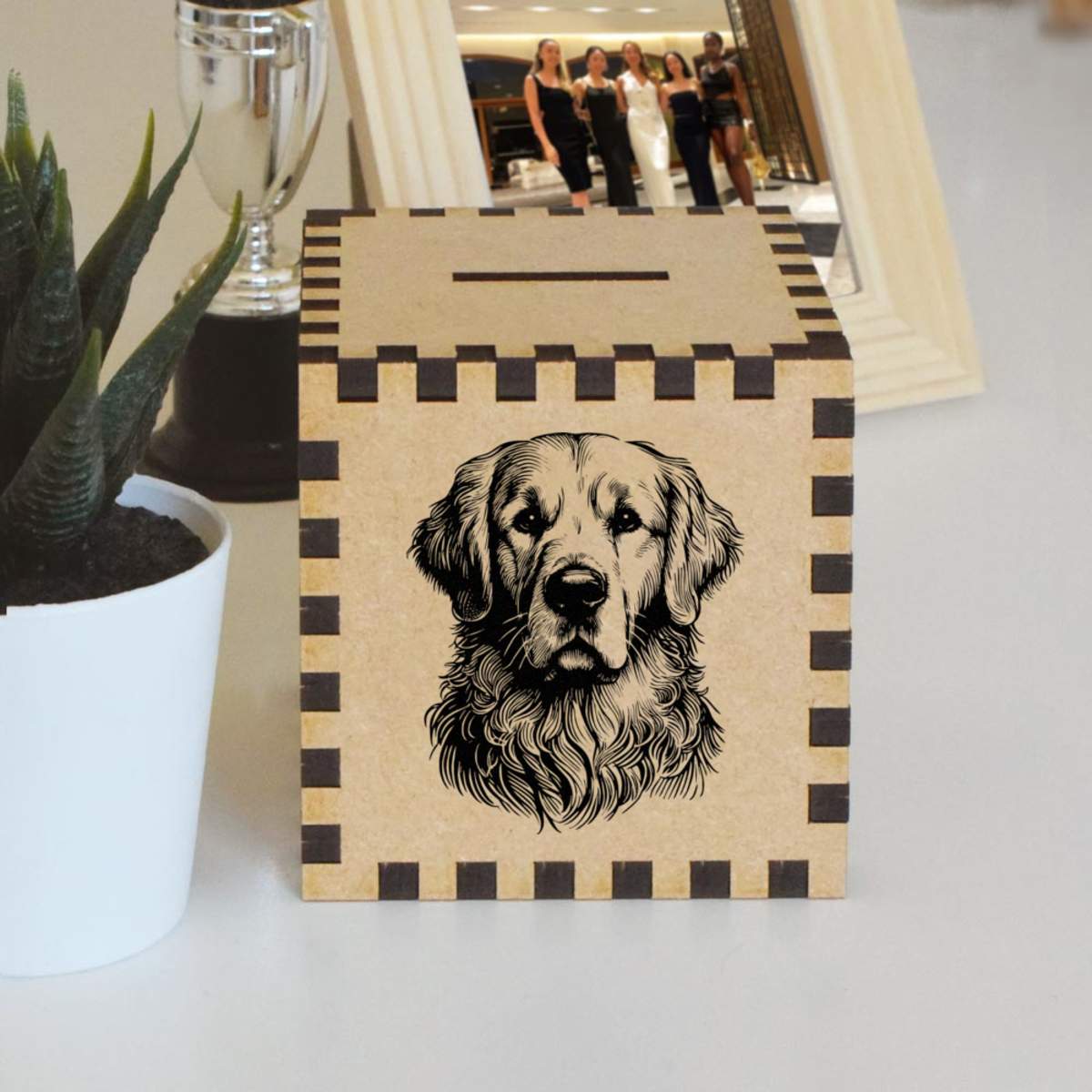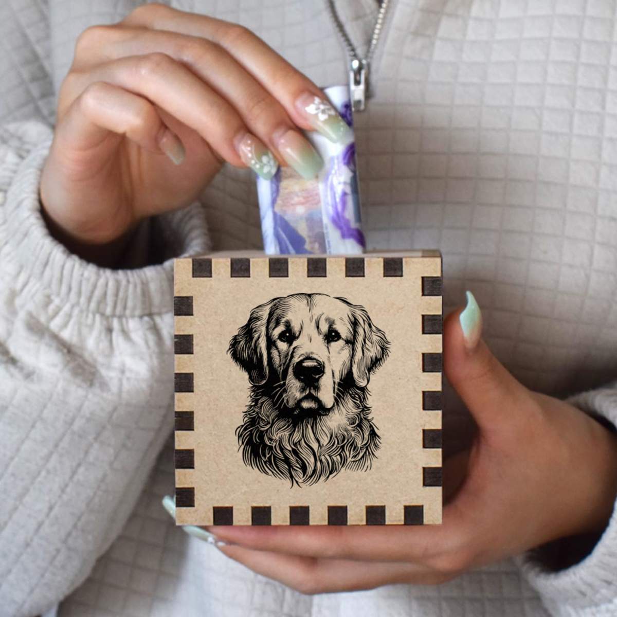 An 8.5cm wooden money box made out of the finest quality MDF and printed on all four sides with a unique design. The bottom is flat and the top has a slot for coins, the box itself is 85mm on each side, with a 35mm x 5mm coin slot, so please be sure it's suitable for you.