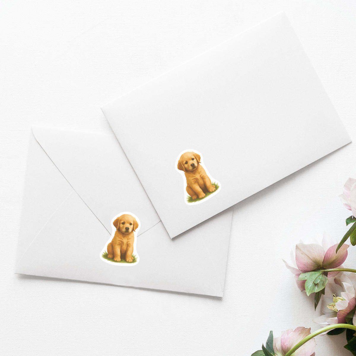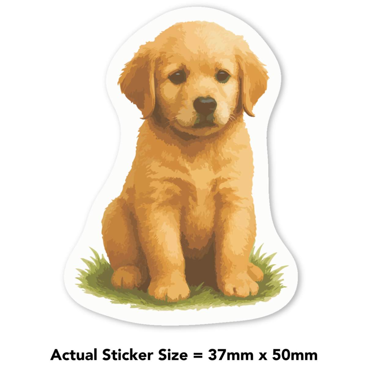 'A cute and fluffy golden retriever puppy is sitting on a patch of grass, looking directly at you.'