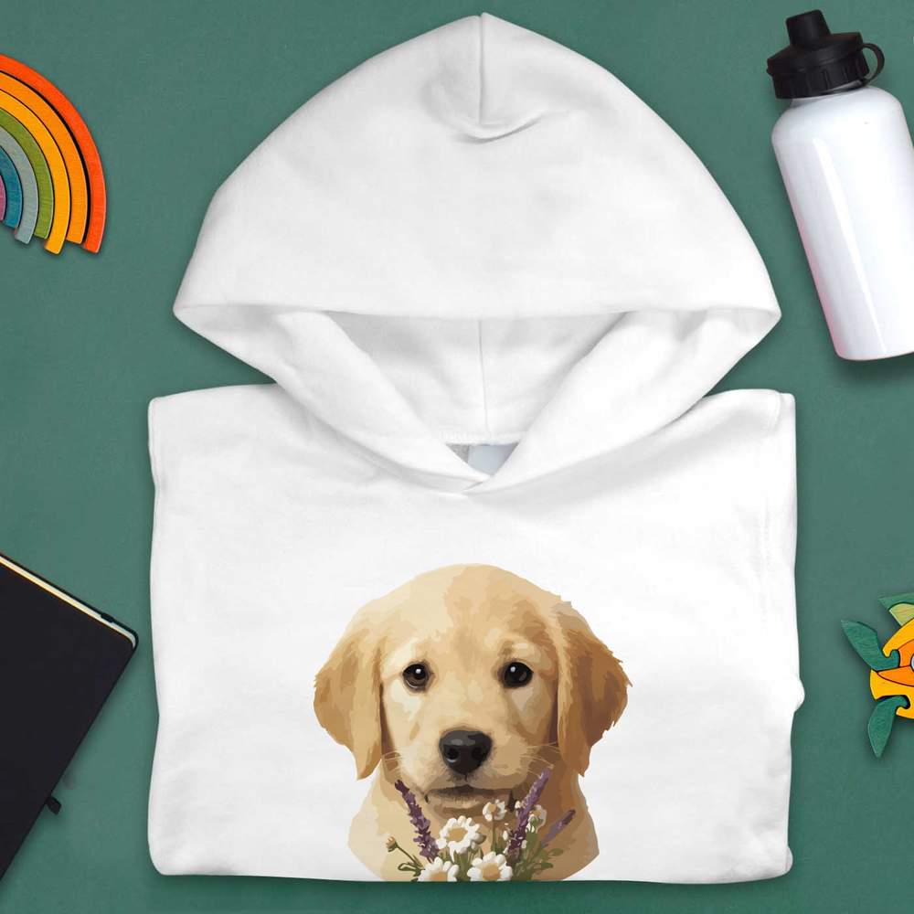 'A sweet design of a golden retriever puppy surrounded by wildflowers, capturing the innocent and gentle nature of the beloved dog breed.'