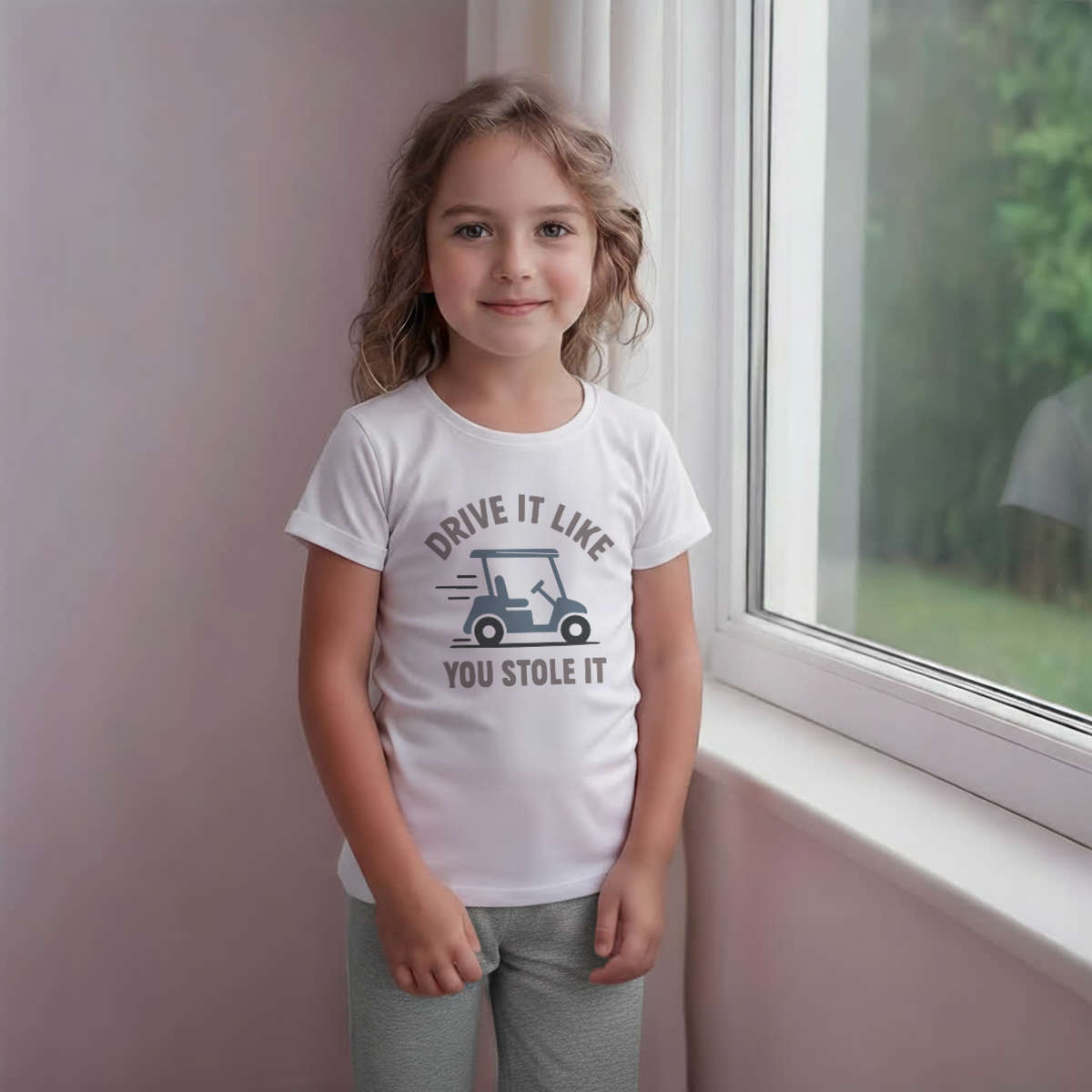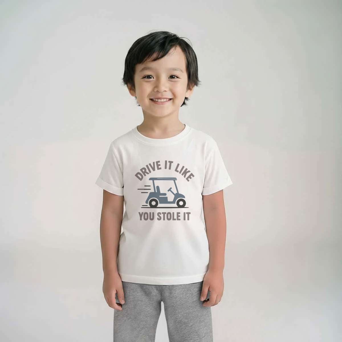'This graphic features a depiction of a small, open-air utility vehicle, stylized to show motion, positioned between two lines of bold text. The text conveys a playful and spirited attitude towards operation.'