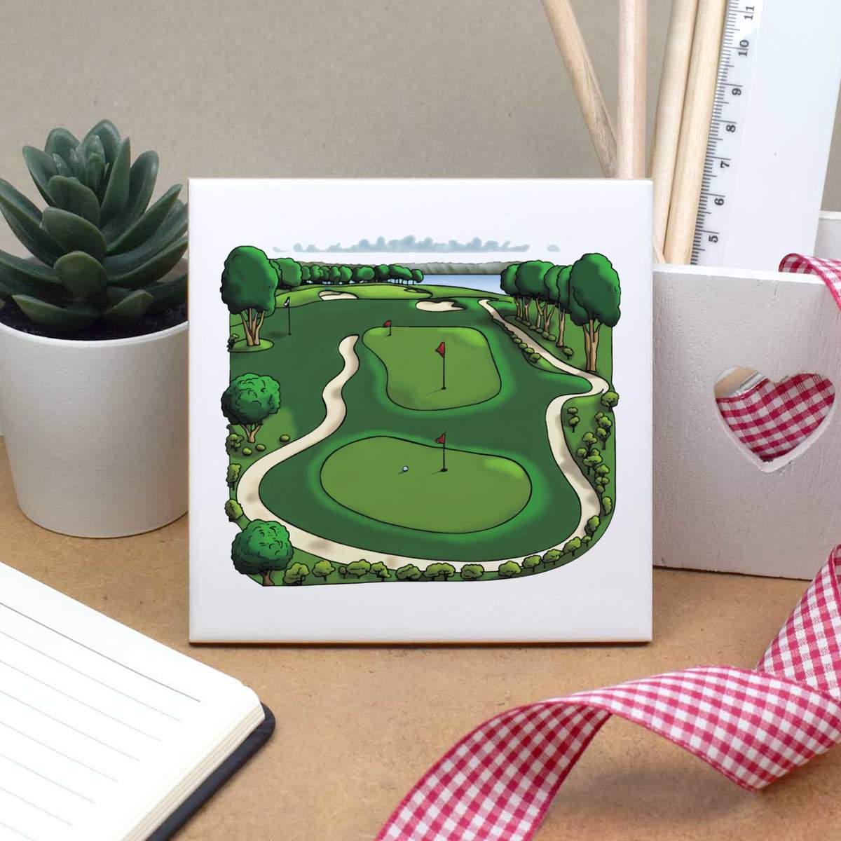 'A serene golf course, with lush green fairways, challenging bunkers, and a picturesque landscape inviting for a perfect golfing day.'