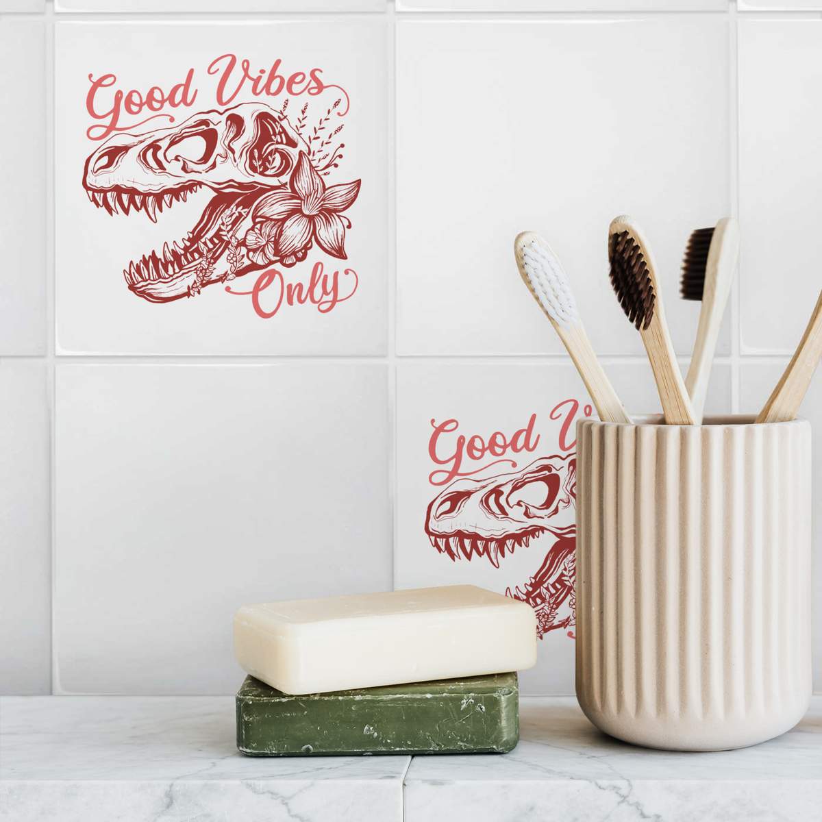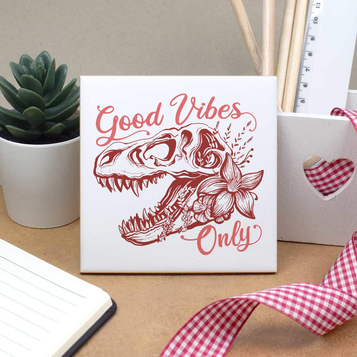 'A pink dinosaur skull with flowers and the positive saying 'good vibes only'.'