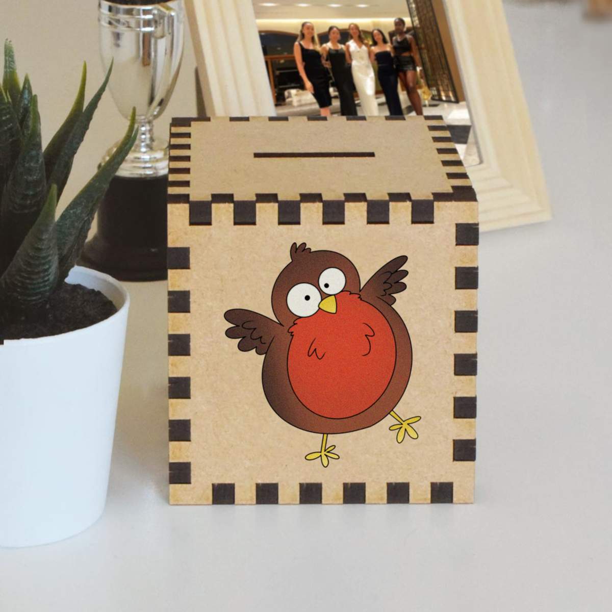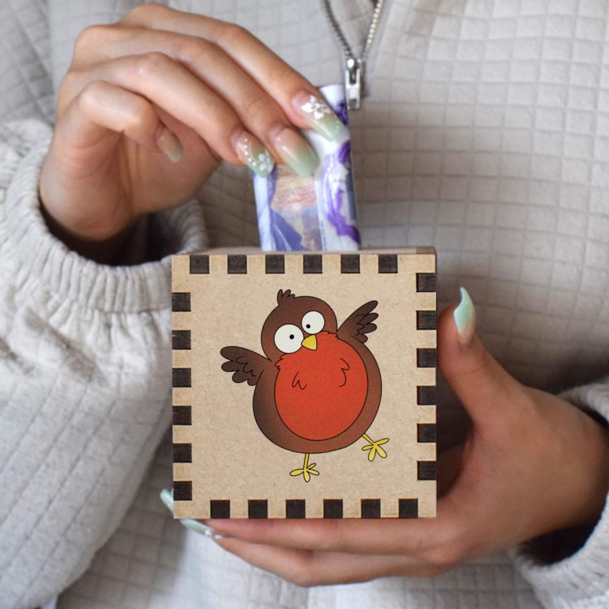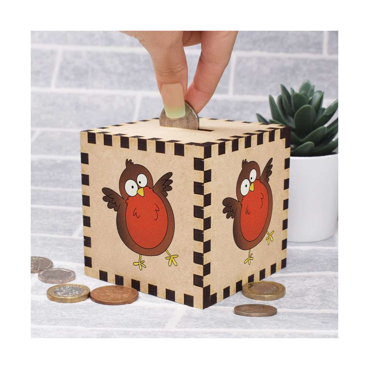 An 8.5cm wooden money box made out of the finest quality MDF and printed on all four sides with a unique design. The bottom is flat and the top has a slot for coins, the box itself is 85mm on each side, with a 35mm x 5mm coin slot, so please be sure it's suitable for you.