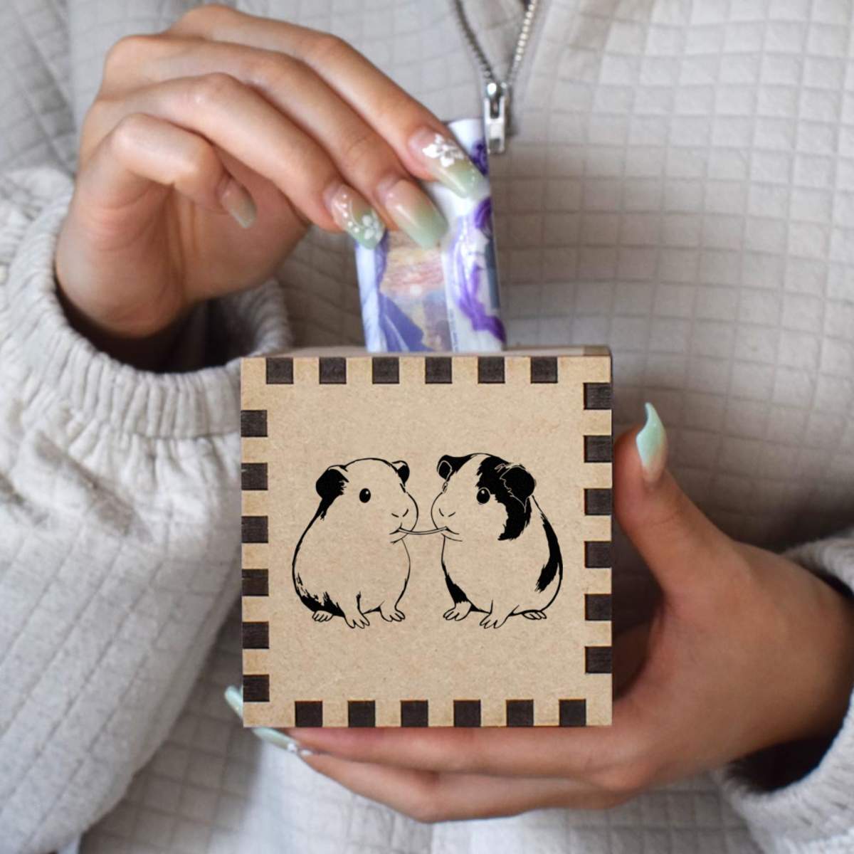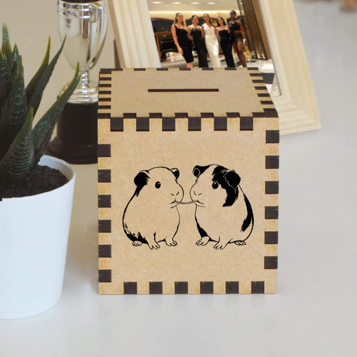An 8.5cm wooden money box made out of the finest quality MDF and printed on all four sides with a unique design. The bottom is flat and the top has a slot for coins, the box itself is 85mm on each side, with a 35mm x 5mm coin slot, so please be sure it's suitable for you.