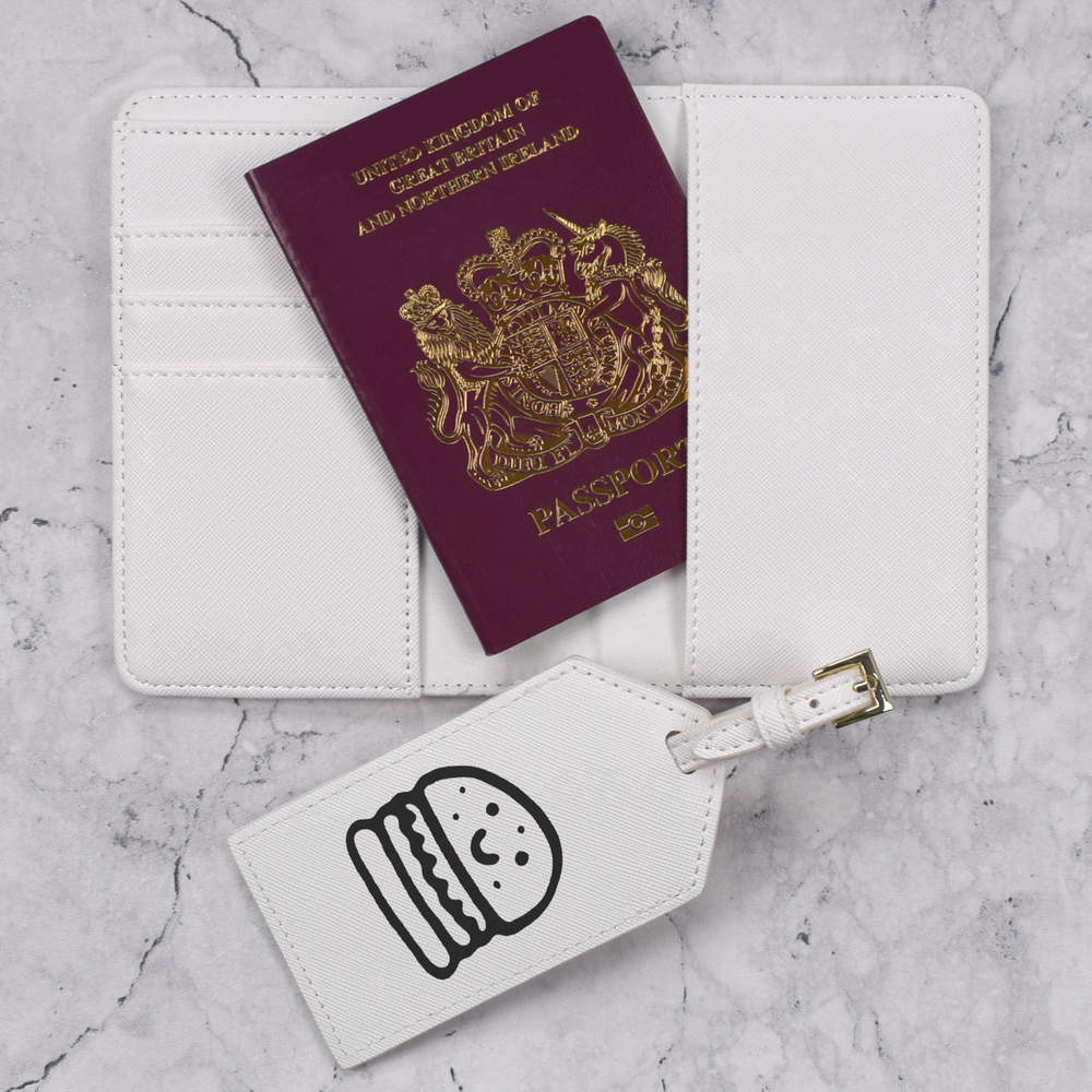 A luxury travel set for holiday makers and jet setters! This premium duo consists of a passport cover and matching luggage tag; both made from white, leather-look PU and printed with a unique design.