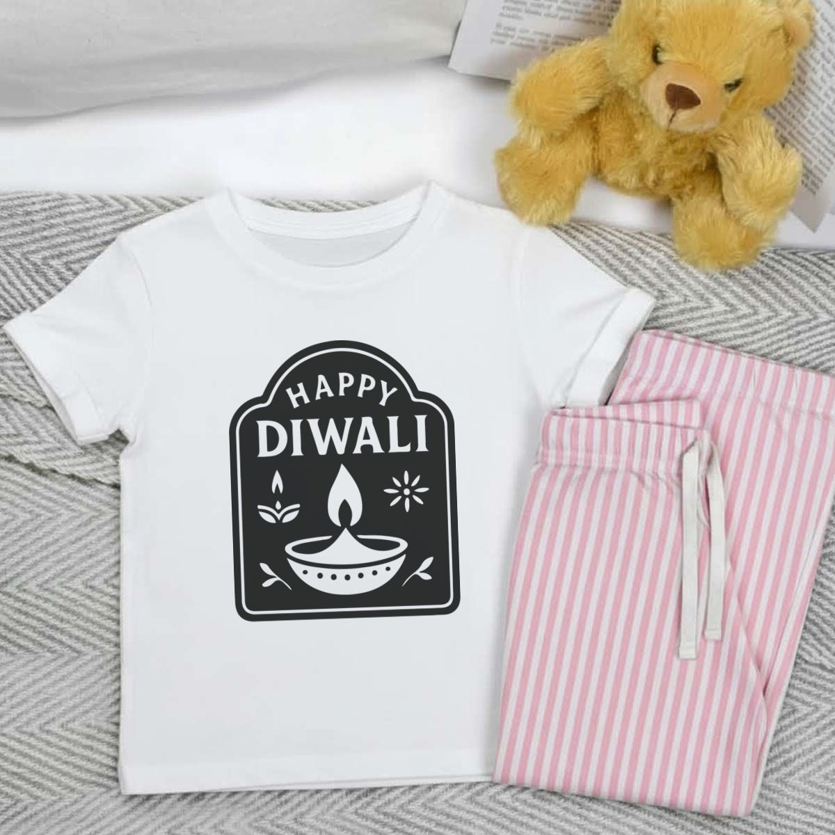 'Happy Diwali Celebratory Design' Kids Cotton Pyjama Set – Comfortable Children's Nightwear, Sleepwear and Loungewear - Unisex for Boys and Girls - Pink, 7-8 Years (KP00399371)
