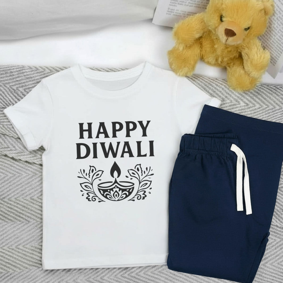 'Happy Diwali Festival Design' Kids Cotton Pyjama Set – Comfortable Children's Nightwear, Sleepwear and Loungewear - Unisex for Boys and Girls - Navy, 5-6 Years (KP00399345)