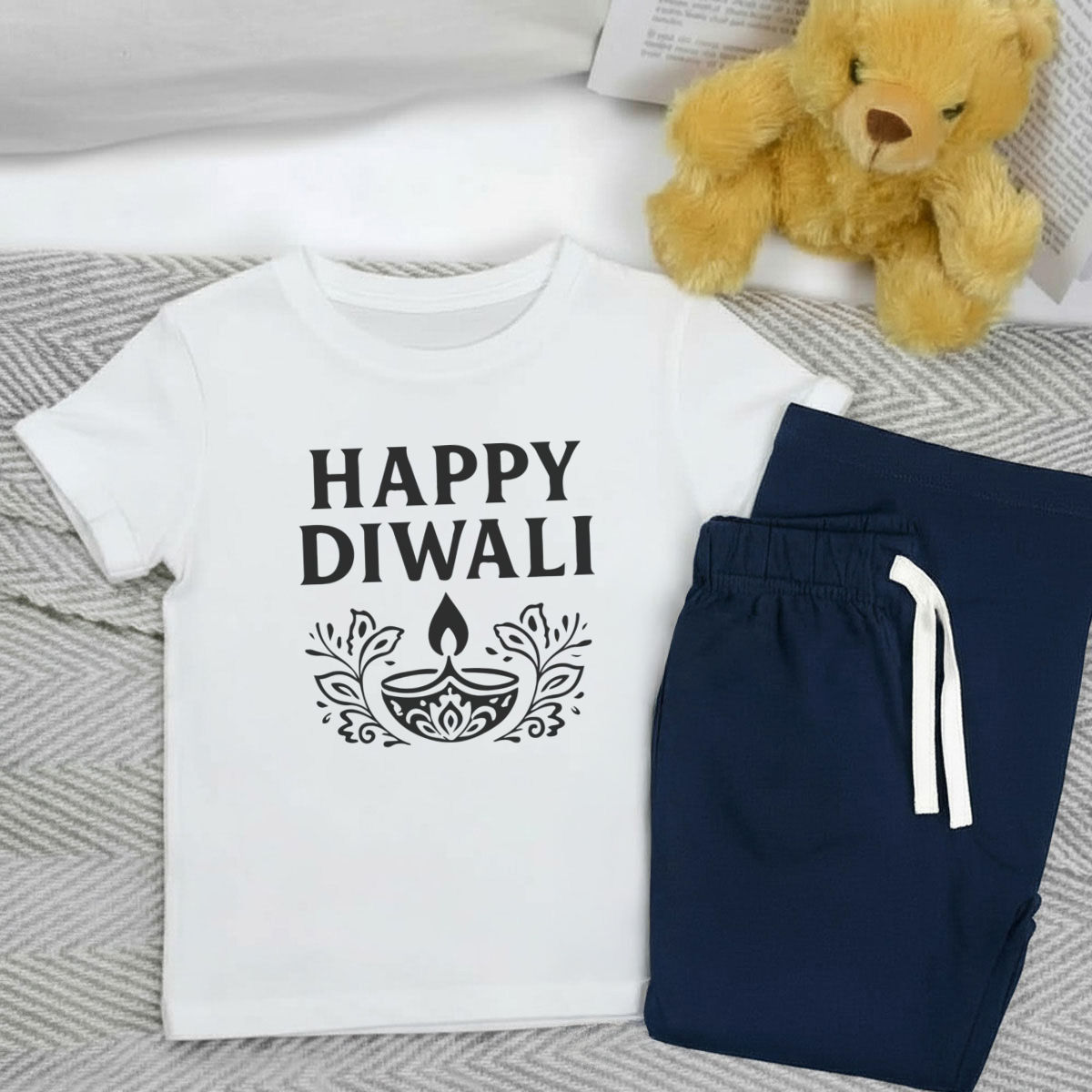 'Happy Diwali Festival Design' Kids Cotton Pyjama Set – Comfortable Children's Nightwear, Sleepwear and Loungewear - Unisex for Boys and Girls - Navy, 7-8 Years (KP00399346)