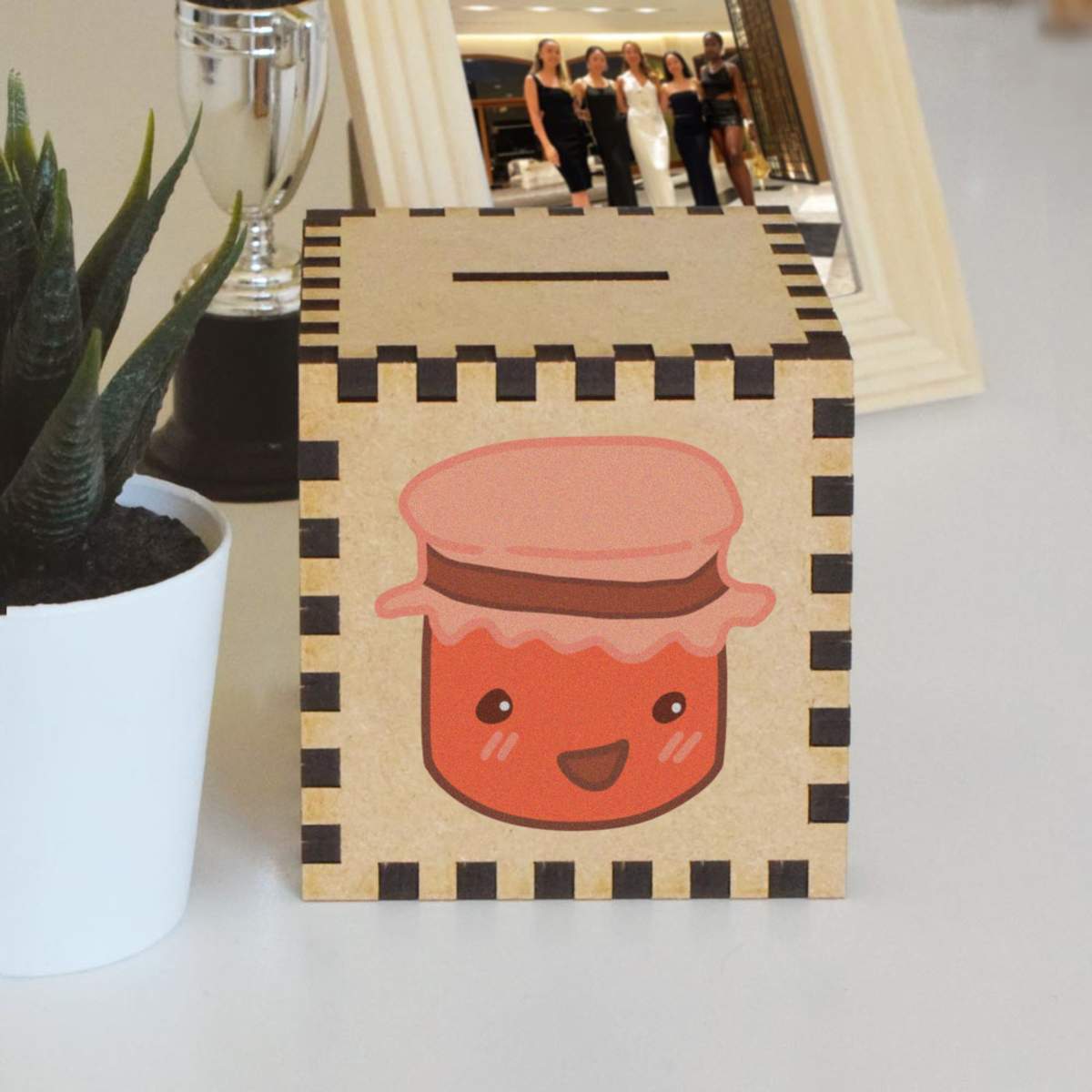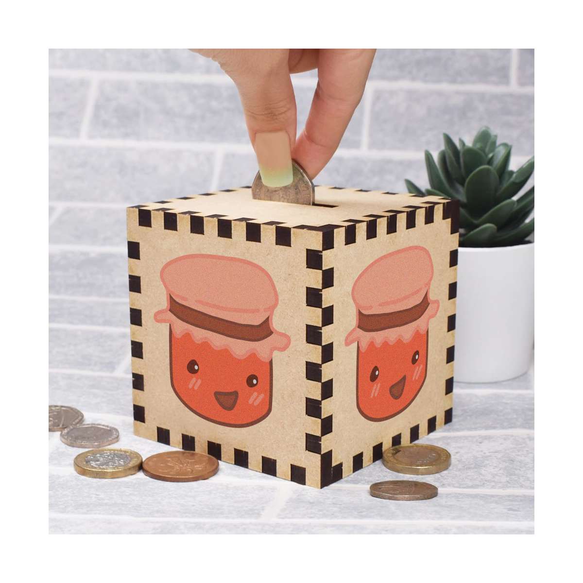 An 8.5cm wooden money box made out of the finest quality MDF and printed on all four sides with a unique design. The bottom is flat and the top has a slot for coins, the box itself is 85mm on each side, with a 35mm x 5mm coin slot, so please be sure it's suitable for you.