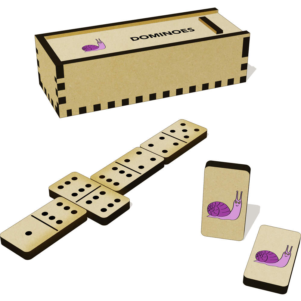 A full set of 28 MDF dominoes + an additional 6 blanks, complete with a slide top box to store them in.