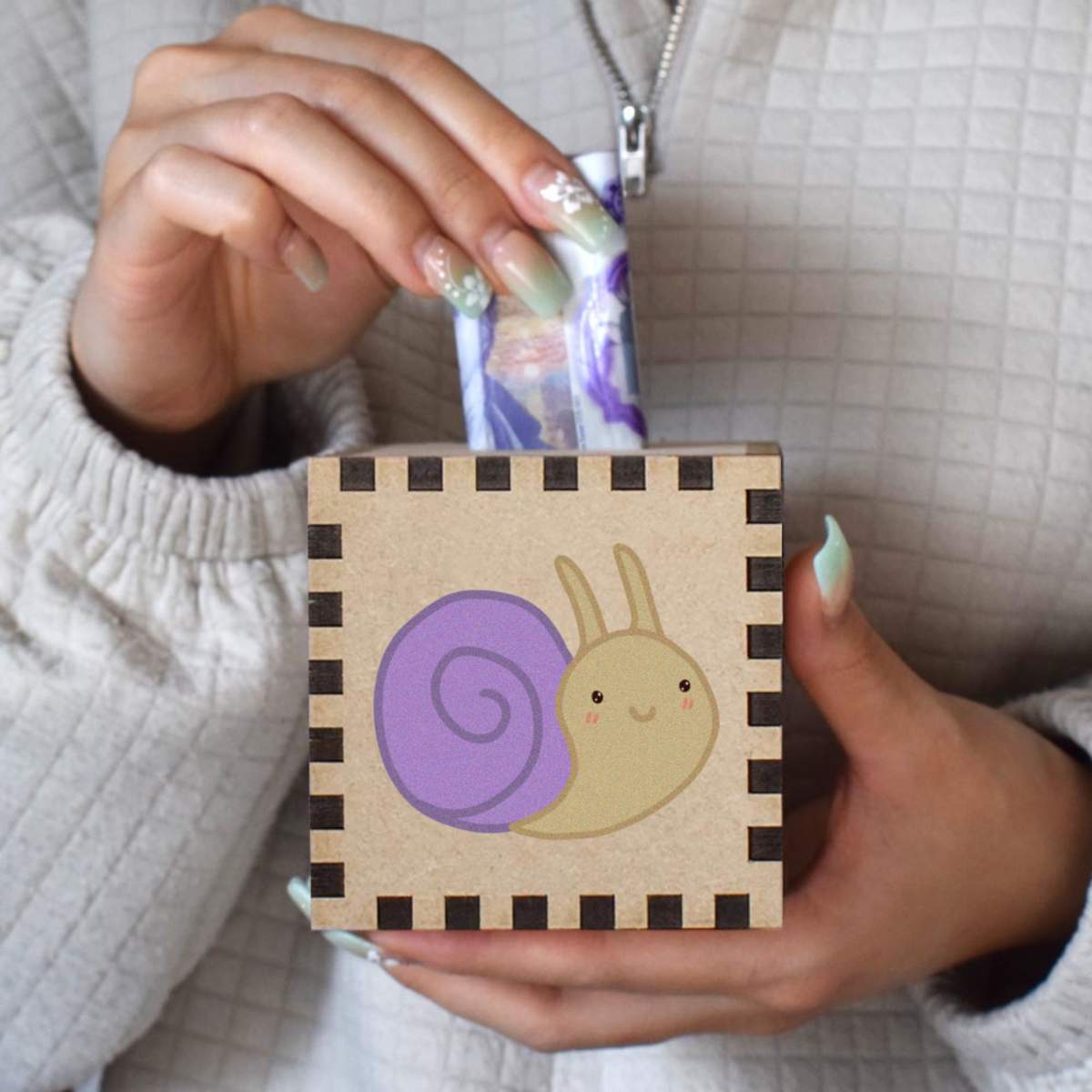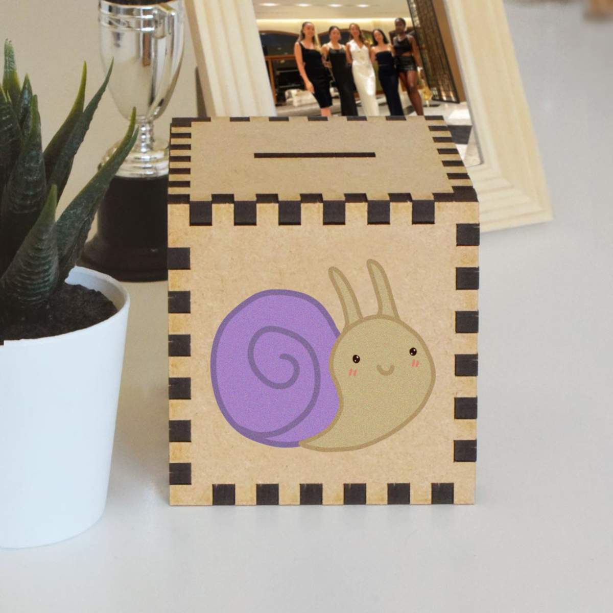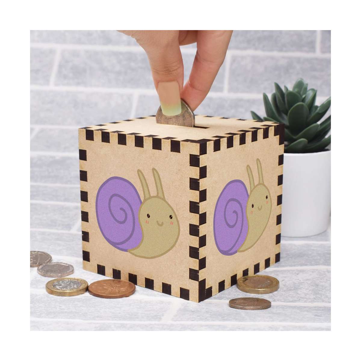 An 8.5cm wooden money box made out of the finest quality MDF and printed on all four sides with a unique design. The bottom is flat and the top has a slot for coins, the box itself is 85mm on each side, with a 35mm x 5mm coin slot, so please be sure it's suitable for you.