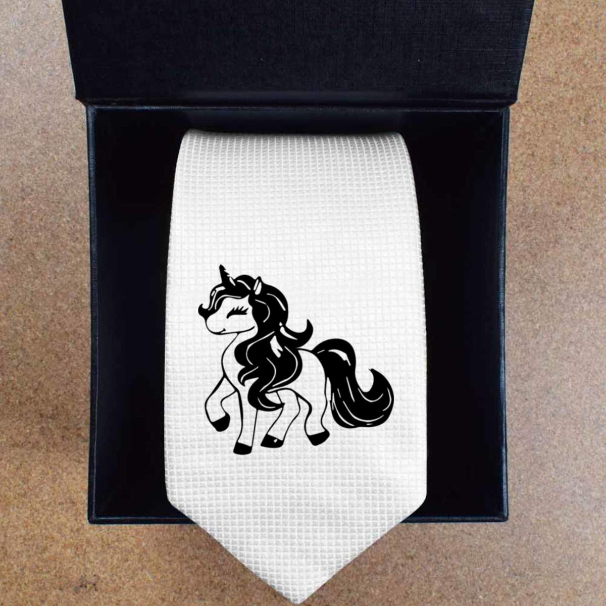 - Slim white tie with black presentation box