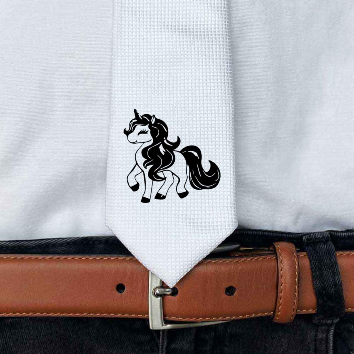 This stylish slim white tie is guaranteed to add class to any outfit. Printed on the front with a design from one of our talented designers, these ties are perfect for formal events, special occasions or making a statement at the office.