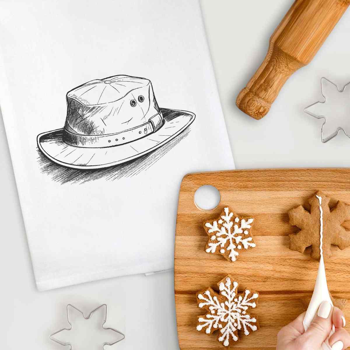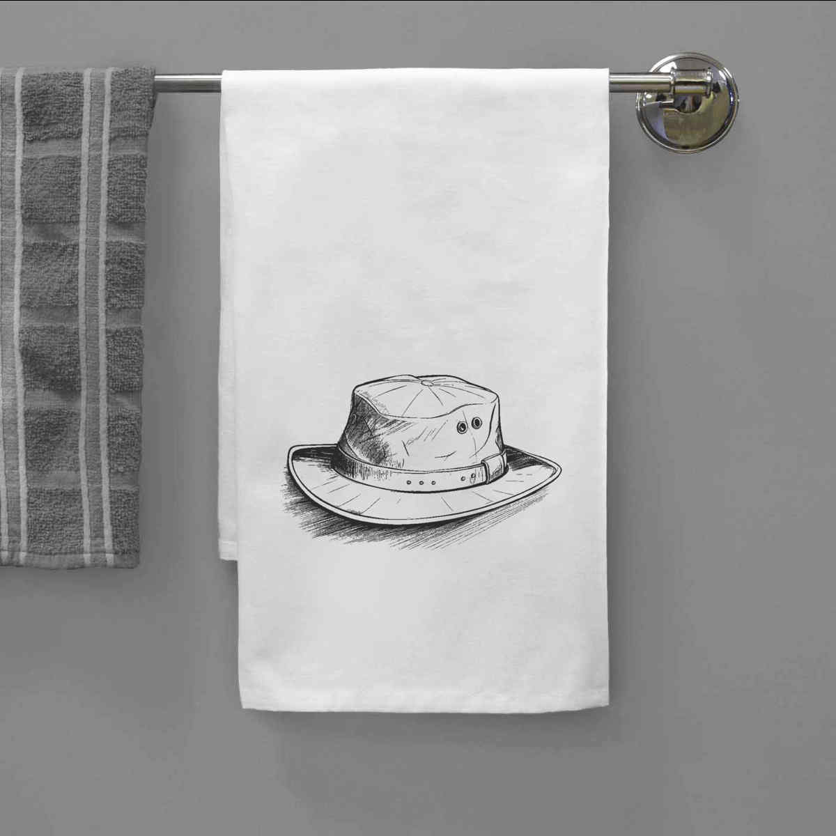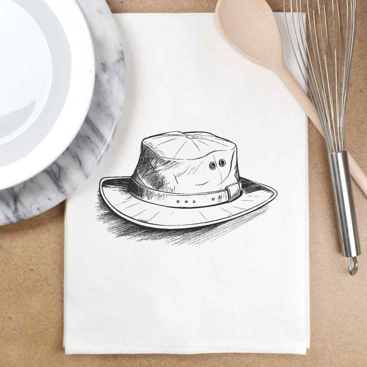 - White cotton tea towel with hanging loop